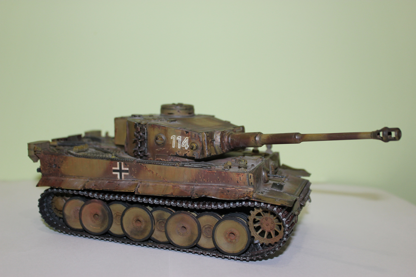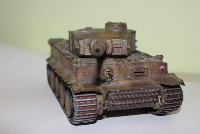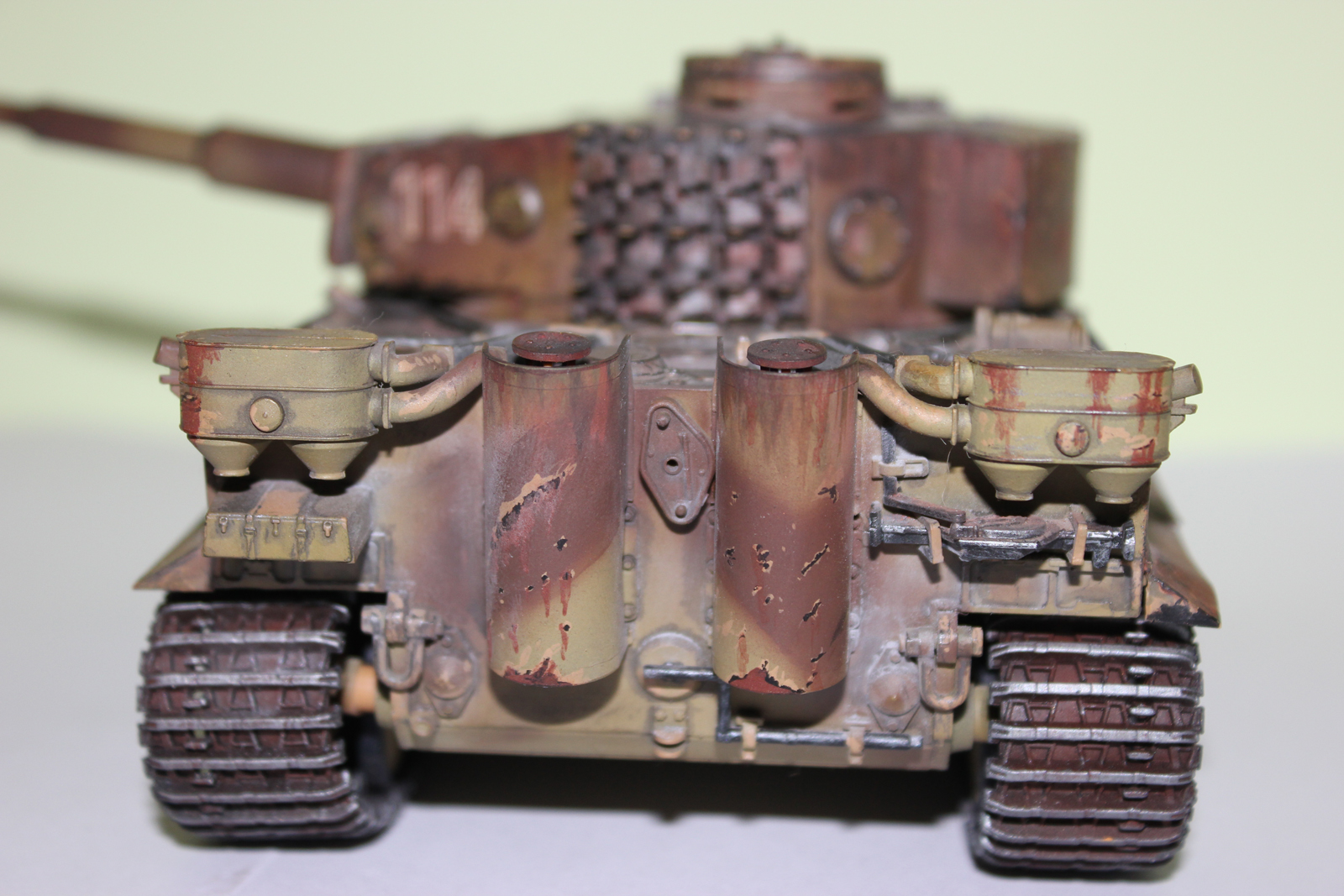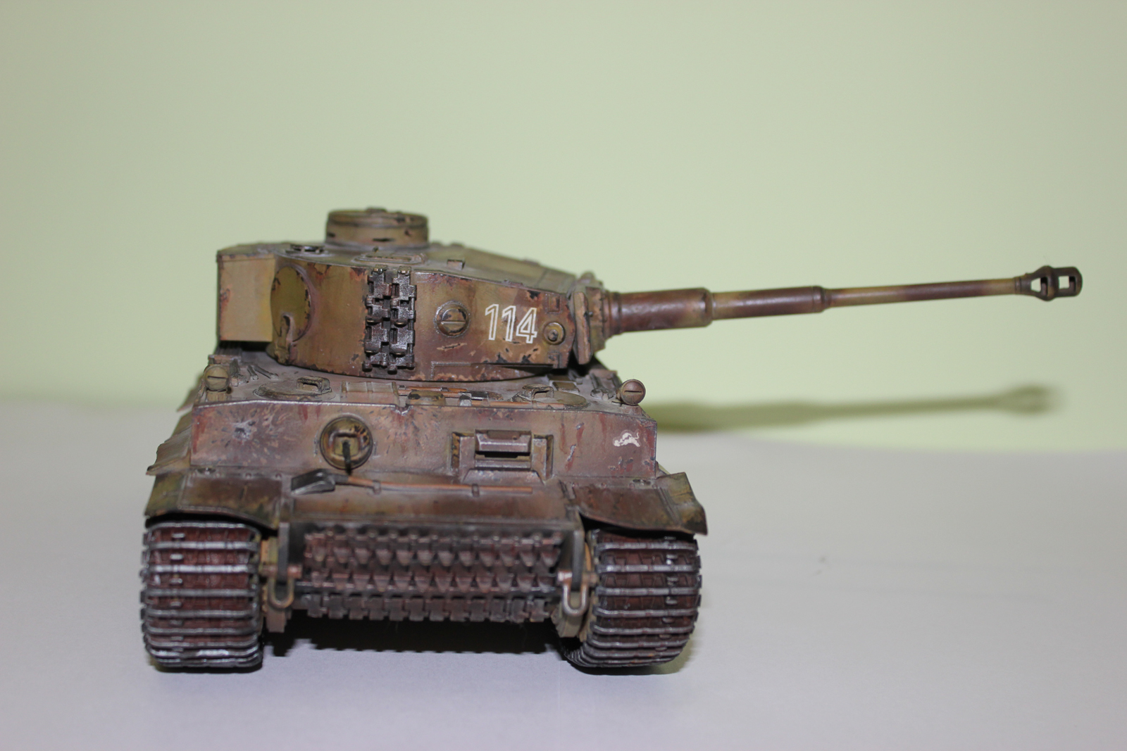 Но , смывку надо бы внимательней делать, например на воздушных фильтрах недотёрли, выхлопные закоптить, приборы наблюдения остеклить и при общей потёртости корпуса стоило катки тоже подрать, бандажи покрашены не очень аккуратно, гусли не лежат как надо,а парят над катками. По матчасти скажут "тигроманы".