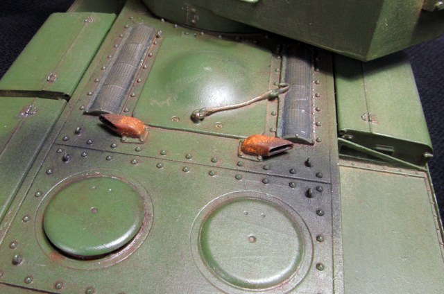 Кстати вопрос по пистолетным портам. Фото КВ-2 с ранней башней не так много, многие после внутреннего взрыва - где пробки и люки выбиты. Но Коломиец в своей книге "КВ-2" дает одно фото ( заводской вариант) где видны заглушки во фронтальной части башни как для пистолета так и над ним (аналогичные порты в корме). Все таки есть вероятность что для этих отверстий были тоже пробки - заглушки. (хоть спереди я их и убрал) Да и трумпетер их дает.
