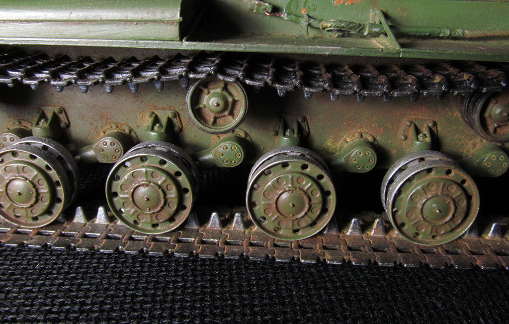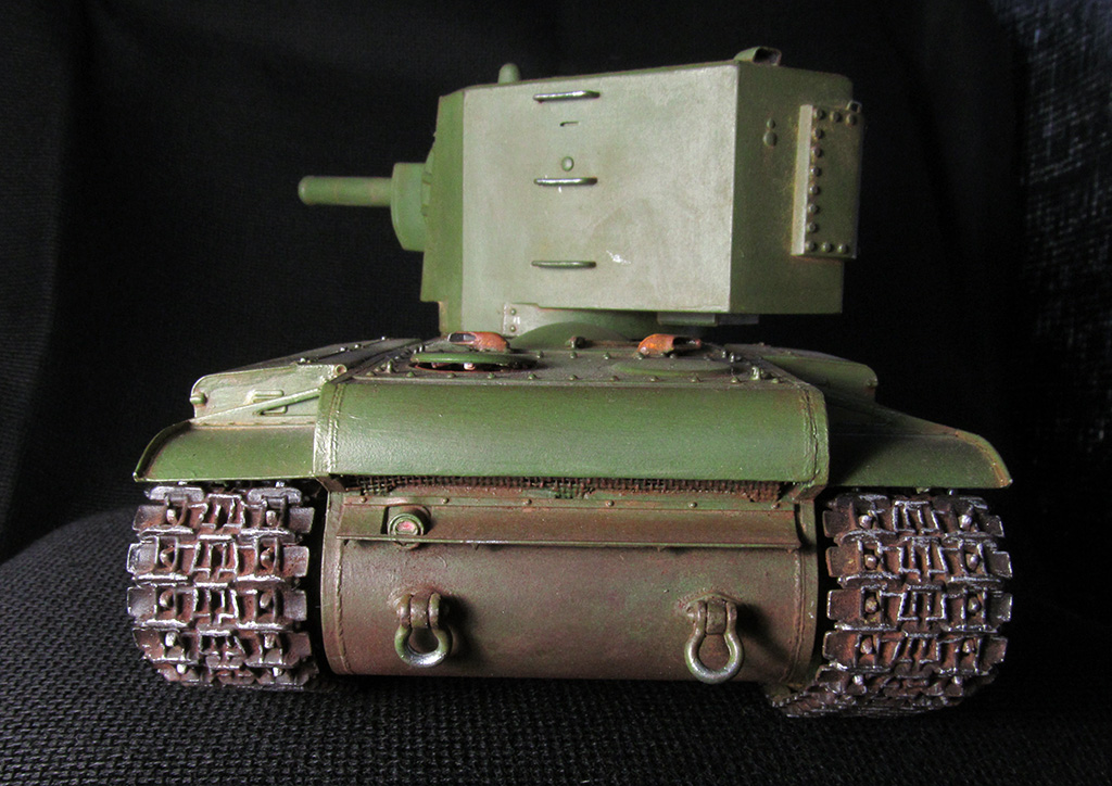 Спасибо. смывкой темной проходил вначале, но правда слегка, потом пастель перебила, хотел ей показать запыленность светлой пылью. Стенки действительно однотонны, в принципе можно было работать на глубину ( так все и делают и на кв 2 учат осветлять сухой кистью), но обычно это бывает когда техника выгорает и "юзается" долго. Учитывая что таких моделей было не много, стояли в ангарах, и сгорели в первые месяцы войны, то немножко допустить однотонность можно. Но все равно согласен большие площади можноа было разбить.
