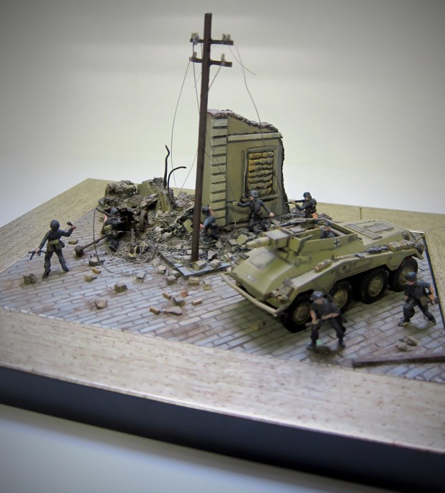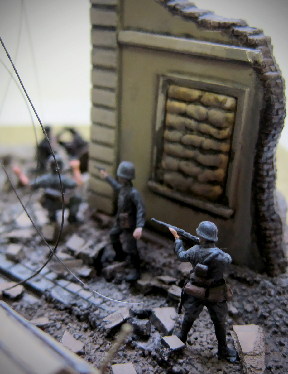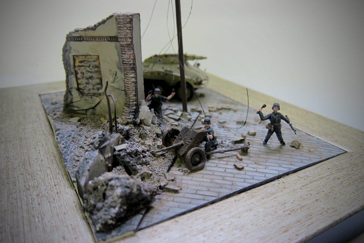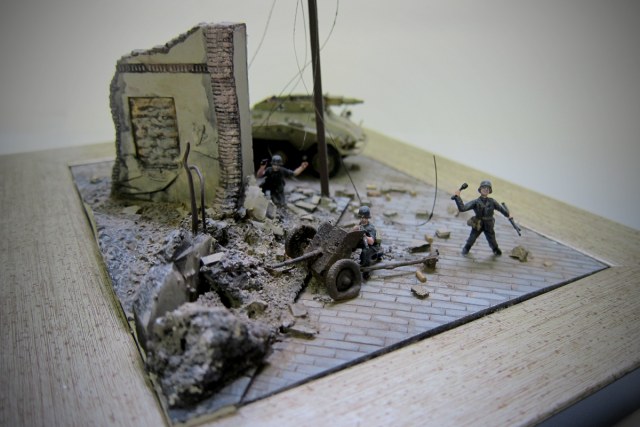 ...Диораму можно "спасти",если убрать немцев у орудия,того,что руки поднял и того,что демонстрирует свою форму и оружие на открытом пространстве и которому жить явно надоело,раз вышел так открыто на мостовую.