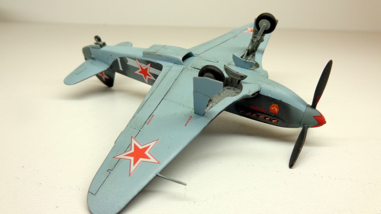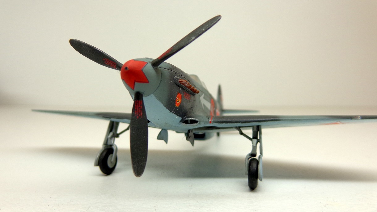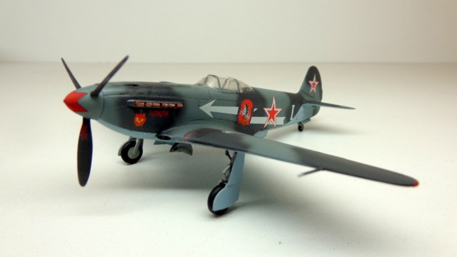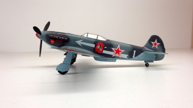 В целом Як очень симпатично получился. Элегантен, красив, стремителен. О недостатках уже сказали. Все таки цвет самолета смотрится зеленоватым, а не серо-голубым. Про слишком размытые границы тоже говорили. Бронестекло У Яка должно быть в обойме (фото №13), а не выглядеть куском плексеглаза (фото № 15). Хотя эти вещи трудно делать, уж боль маленькая модель.