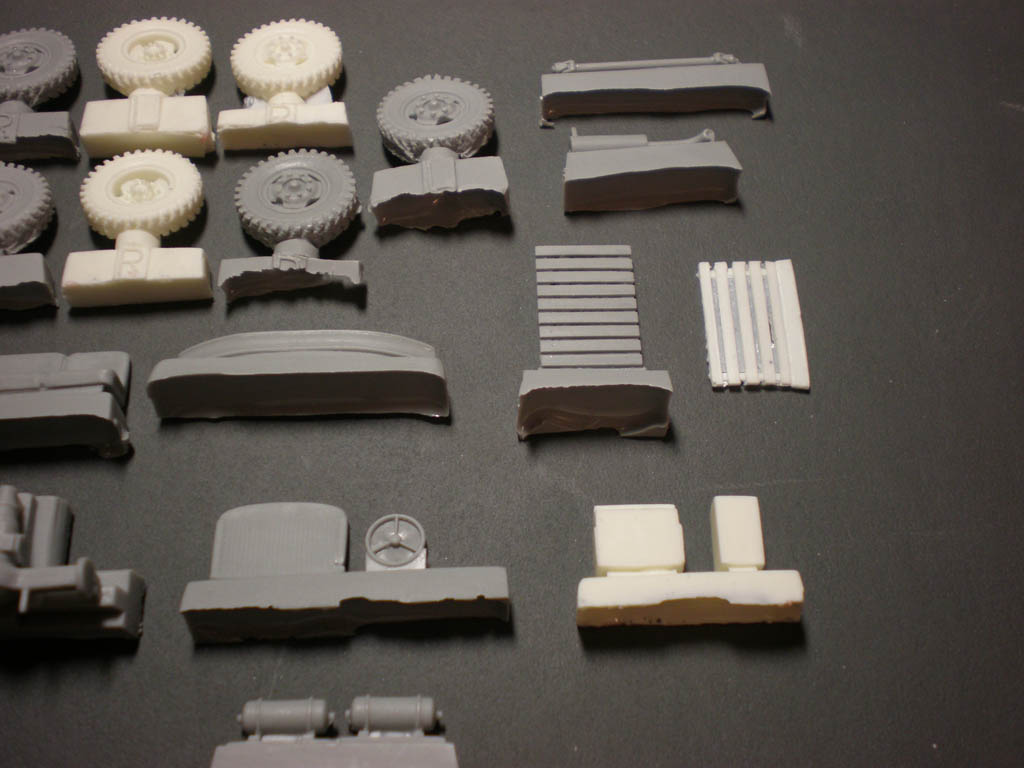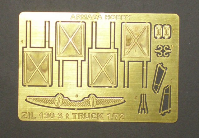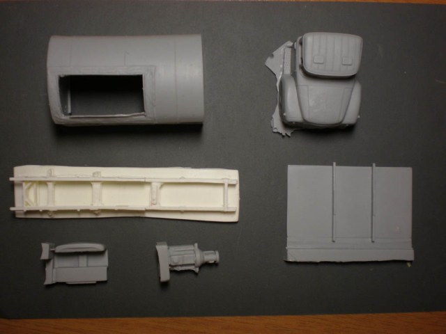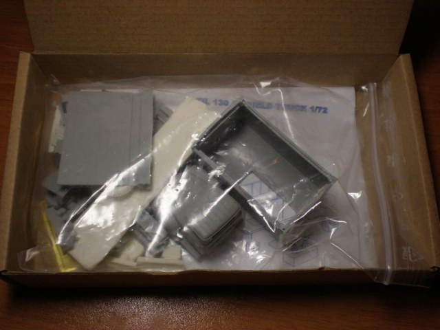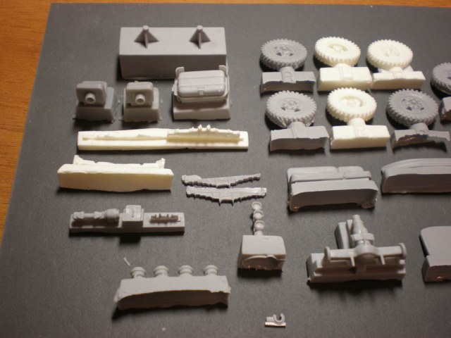 В коробке собственно детали из смолы, 2 платы травления, пленка с разметкой окон кунга и лобовое стекло с фарами. Деталей много, комплектность не проверял. Руль идет из смолы, это очень хорошо, плоский из травла нам не нужен. Сразу обратил внимание на раму, т.к. в ТЗ-7,5 пришла кривая, придется на нем делать новую. В этом наборе все ровное. Еще сразу не понравился протектор колёс, он какой-то "внедорожный". Жаль танкоград перестали их делать. Не нашел детали мачт, видимо чтото из области сделай сам.
