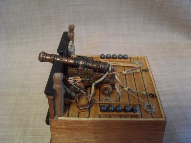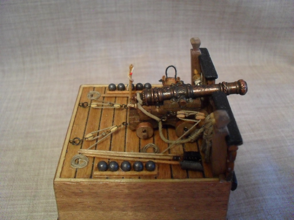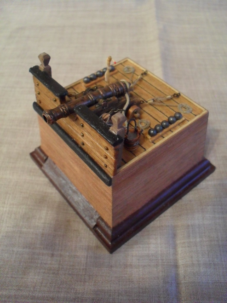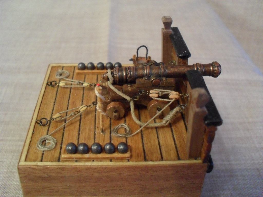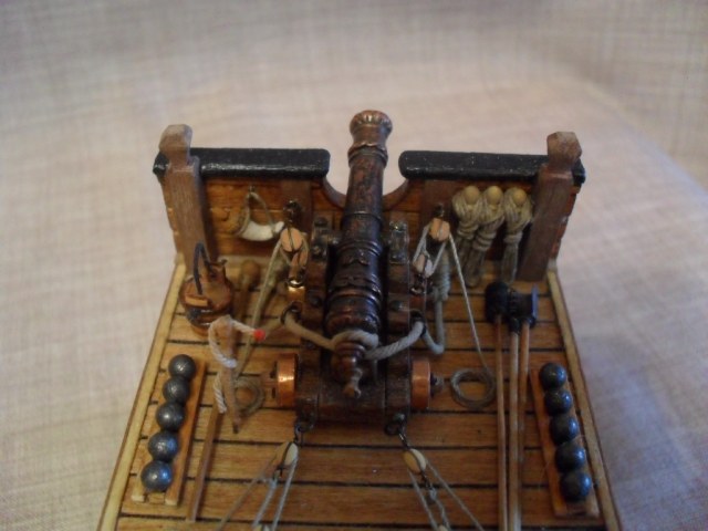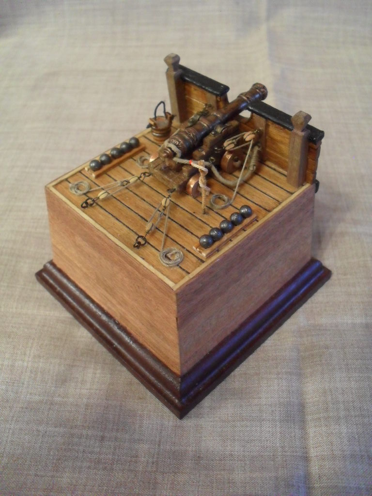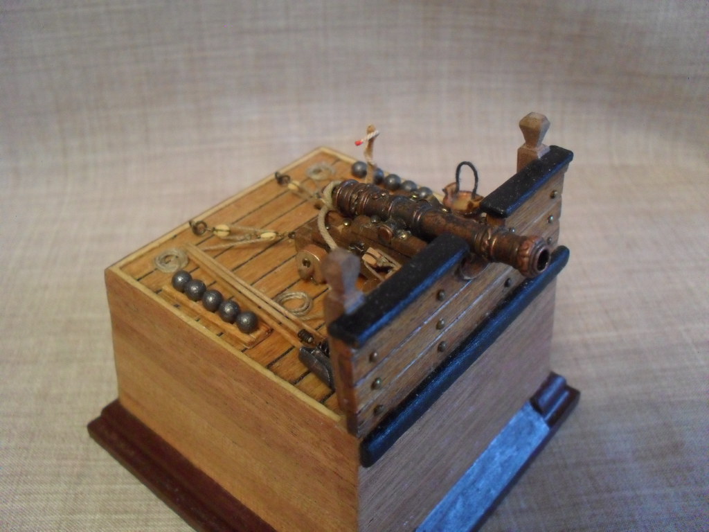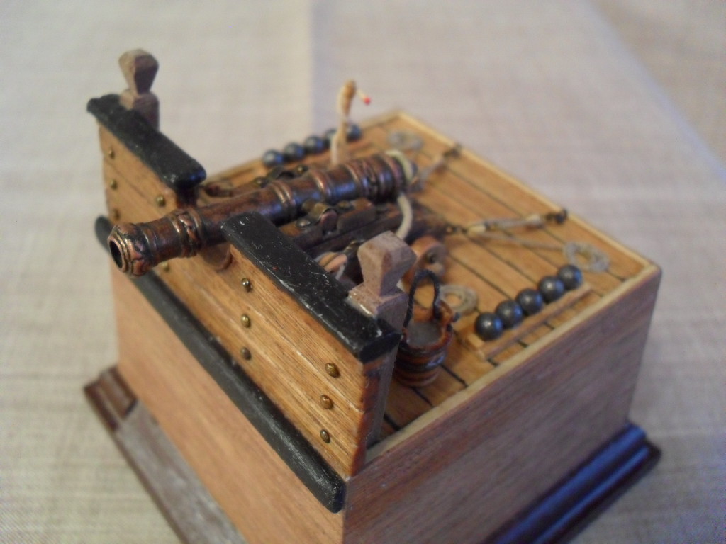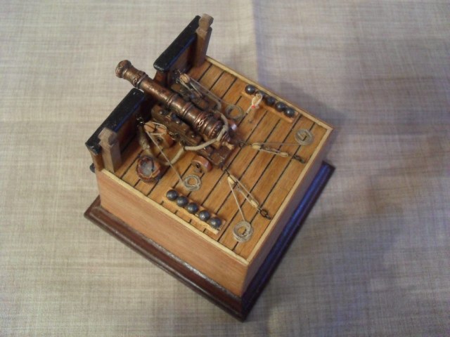 Хорошая виньетка вышла. Корпус, вижу, не от жемчужины, само орудие - тоже. Планширь можно было зашлифовать по лучше - уж больно он шершавый. Нет вытервейсов - учитывая размер советую их доделать. Странное положение корзин для ядер, хотя может такие были, но я не встречал. Размер виньетки очевидно не 600*600, а 60*60.