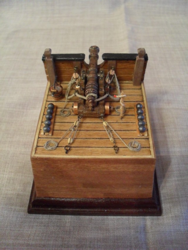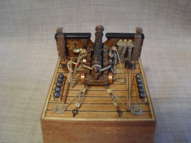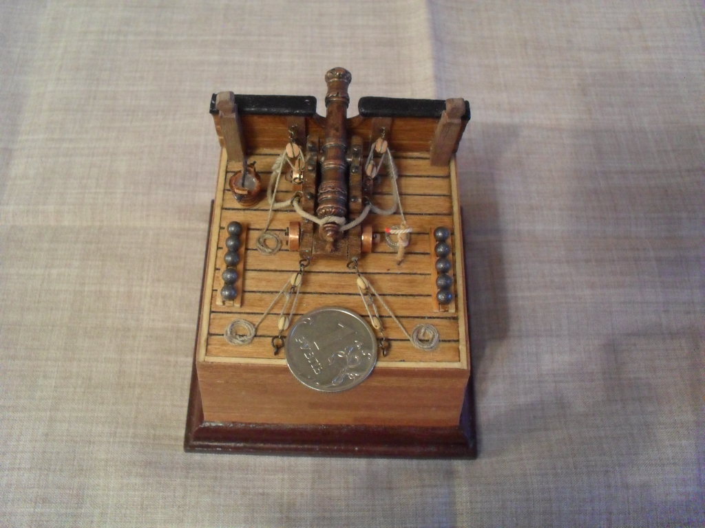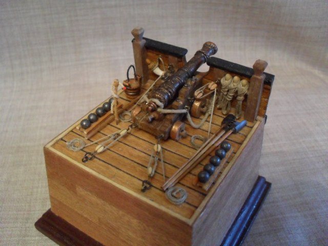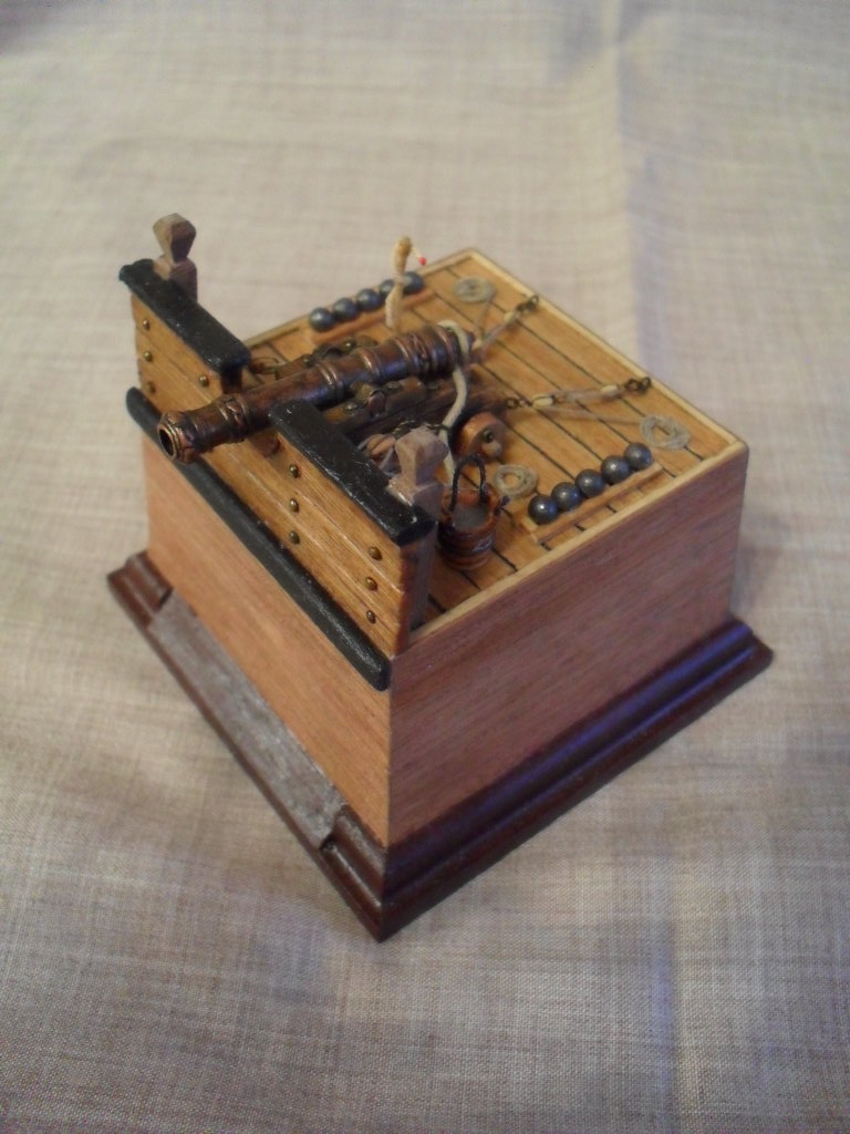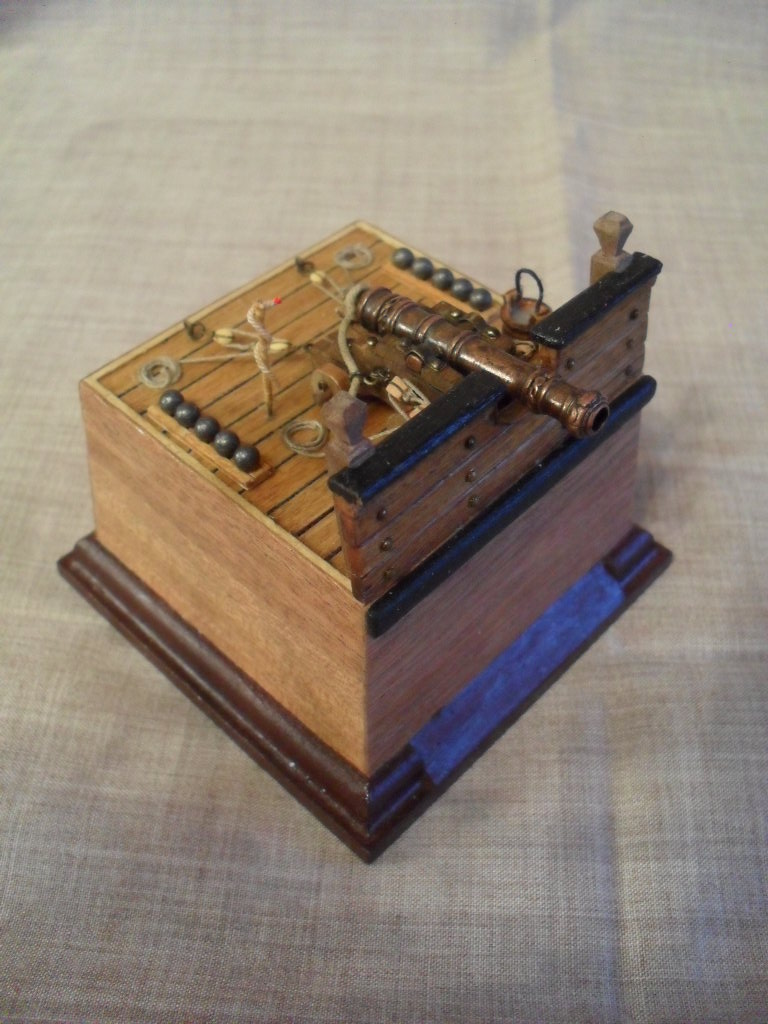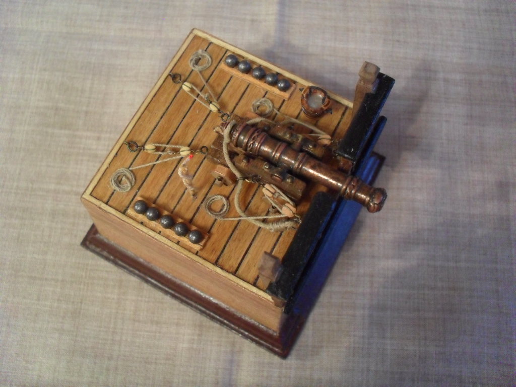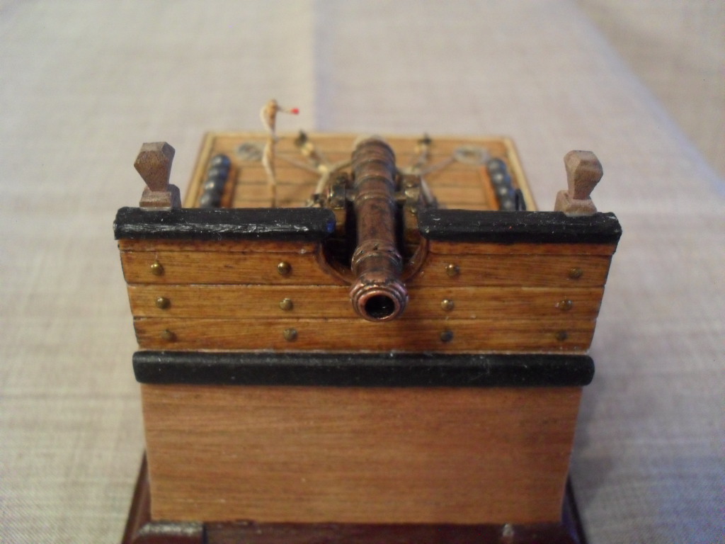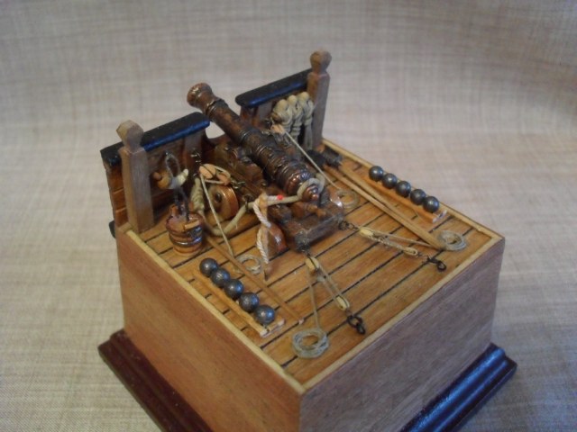 Хорошая виньетка вышла. Корпус, вижу, не от жемчужины, само орудие - тоже. Планширь можно было зашлифовать по лучше - уж больно он шершавый. Нет вытервейсов - учитывая размер советую их доделать. Странное положение корзин для ядер, хотя может такие были, но я не встречал. Размер виньетки очевидно не 600*600, а 60*60.