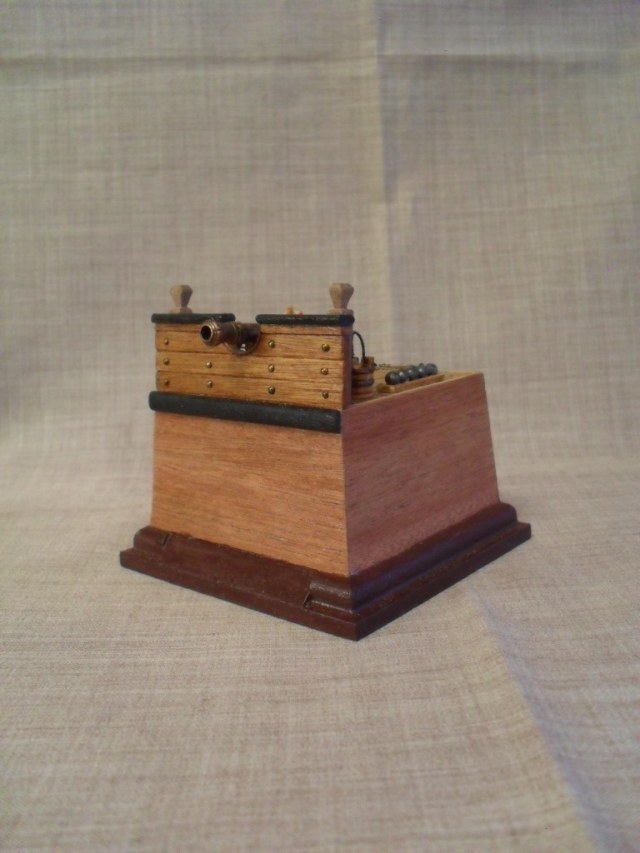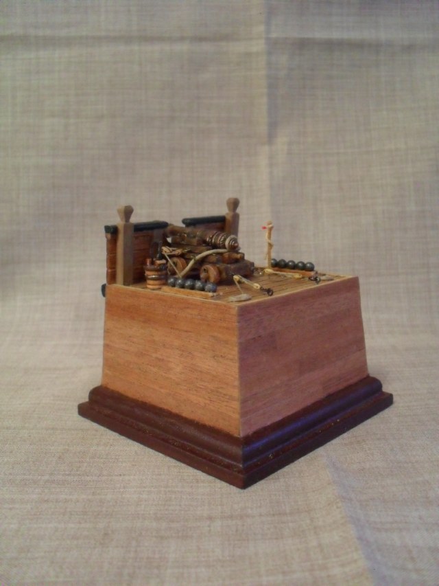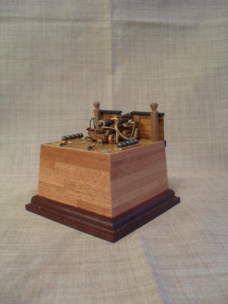 Прикупил я как то журнал из серии «ЧЖ» с орудиями, очень стволы понравились, и отложил до лучших времен. А недавно перебирая свои сокровища, наткнулся на эти заготовки, и так захотелось их пустить в дело. Но так как достойного корабля на стапелях пока нет, стал обдумывать возможные варианты. Пока голова была занята умными мыслями, руки сами начали строгать, пилить и клеить. В общем, через пол часа отступать было уже поздно. В дело пошли обрезки реек и прочие отходы кораблестроения. Размер всей композиции ограничивается размерами подставки 60 х 60. Маловата, конечно, но что было под рукой. Палуба и борт выполнены из кленовых реек окрашенных масляными красками и тонированных кузбасском. Обвязку постарался передать максимально полно, но вот работать она точно не может. Откатные тали короткие (опять размер площадки). Брюк сначала сделал достаточным для отката орудия на необходимую для зарядки орудия длину, не понравилось. Обрезал.