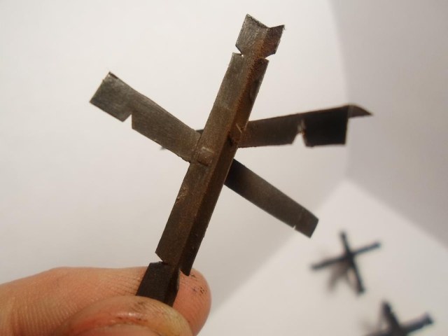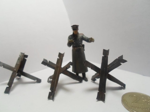 Ну если Вам уж так необходимы ежи то могу выслать чертеж с размерами и схемой сборки для 35 масштаба. Если из пивжести нарезать то необходимо сначала обжечь её иначе будет ломаться на сгибах. Результат можете посмотреть на примере моей диорамы "Фронтовые подруги"