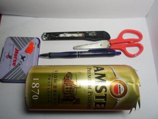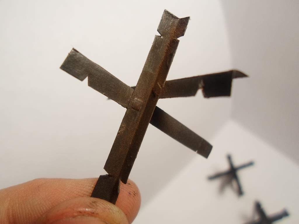 Вот решил сделать ежи. Долго я думал, хотел из покупных рельсов, но увы за рельс 110 рублей, простите. Имея в завалах до кучи пив-жести, я принялся за дело. Для изготовления надо иметь шпатлёвку(я не использовал, а зря сварные швы можно было сделать), ножницы, канцелярский нож, зажимы для травления ( не было, пользовался коробочкой для печати), линейка, жесть, шариковая рука и терпение.