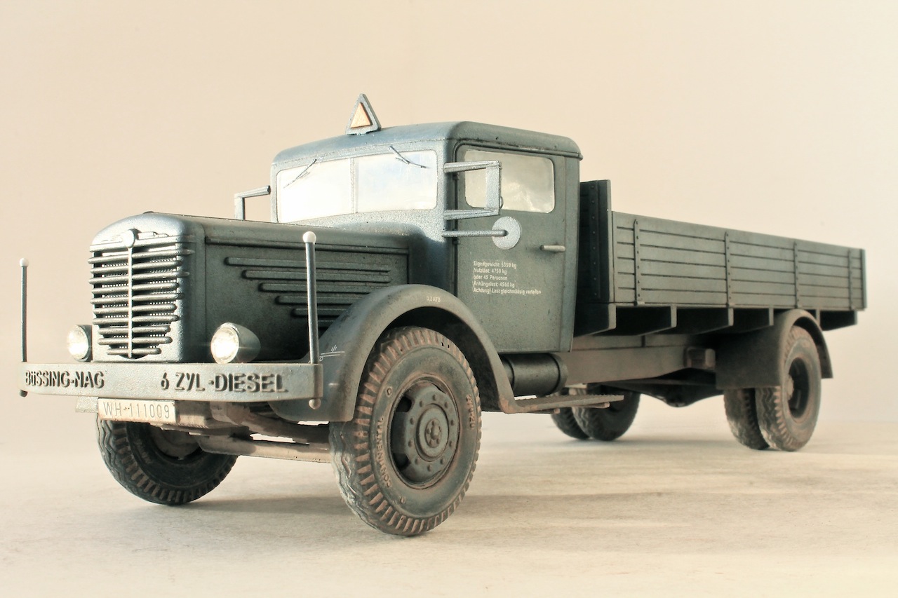 нда, модель получилась не очень, немасштабность деталей удручает, некоторые детали можно было доработать самостоятельно, без покупки афтермаркета, даже можно было фактуру дерева попытаться изобразить. колеса, как уже сказали подходят и от мерса 4500. что с окраской, почему такая шагрень/крошка (что это вообще!?) на кабине (на фото 11 вокруг лобового стекла и нетолько)?