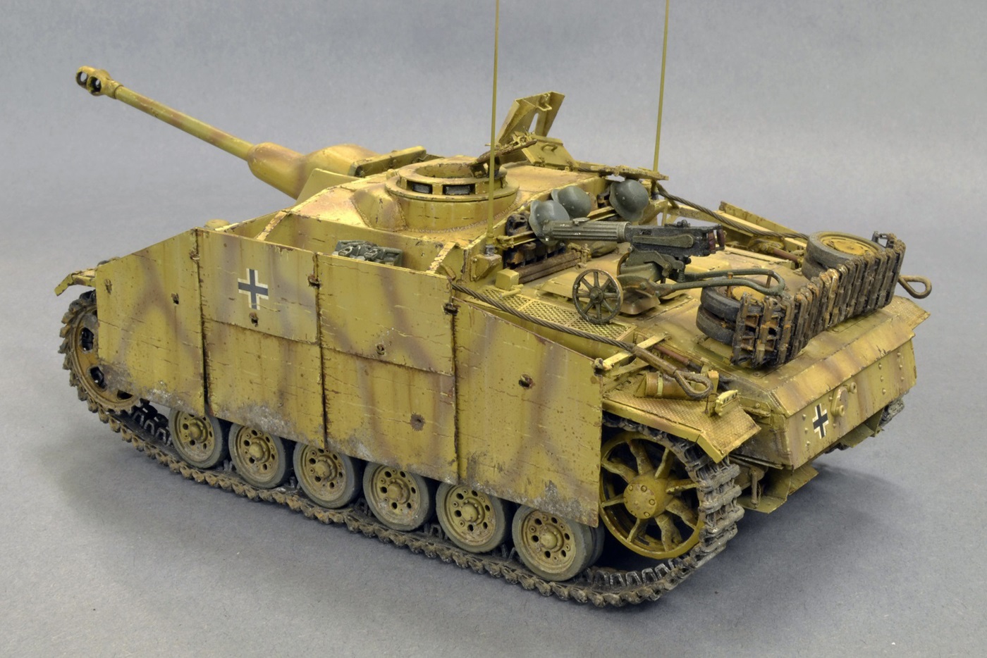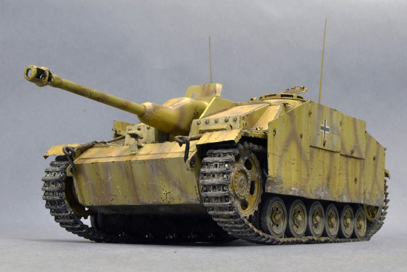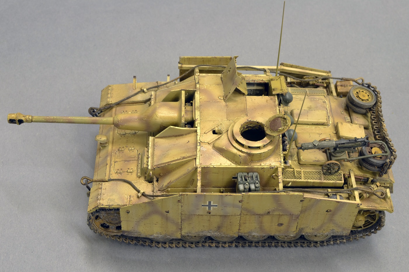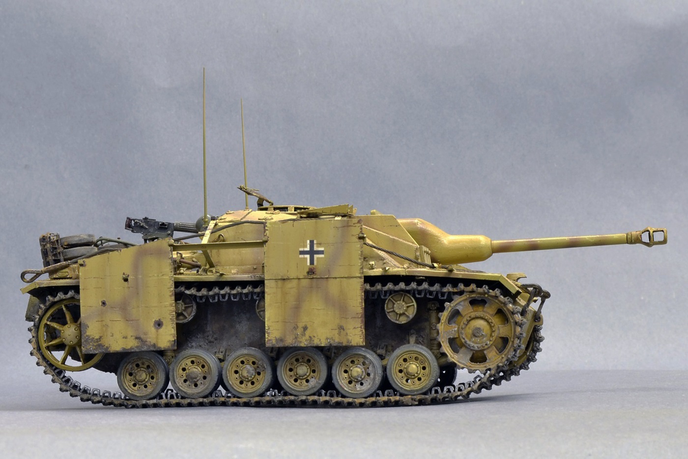 спасибо, зап.траки прикручены проволокой к гребням через катки, делал по фото, не копчу стволы, мой бзик)), гусеница и подвеска рабочии, при фотографировании не уследил и не поправил, вот и играет, я облой обычно убираю под увеличительным стеклом, но тут проглядел слева на конце ручке-дуге, осталась небольшая полосочка, вообще "максим" от звезды так себе, не копиен и много облоя, как понять много жёлтого? дюнкельгельб-это и есть тёмный жёлтый, тут уж ничего не поделаешь, много синего не получится)), вы описание повнимательнее почитайте, например вот это " машина выпуска ноября-декабря 1943г. так сказать мид со всеми вытекающими, а именно-литая маска (устанавливалась с ноября 43г, сварные тоже ставились до конца производства), поддерживающие цельнометалические ролики (с ноября 43г., с резиновыми бандажами также ставили до конца производства), крепления экранов раннего образца (изменилось в марте 44г.) отсутствие циммерита (мазали с декабря 43г. по сентябрь 44г.) и т.д., вообще Ausf G самая массовая модификация, и на протяжении всего производства было внесено множество изменений.", чтобы всё это узнать и подогнать модель под временной период я и штудировал литературу, а травление я применил чтобы модель выглядела живее, в самом наборе я косяков не обнаружил