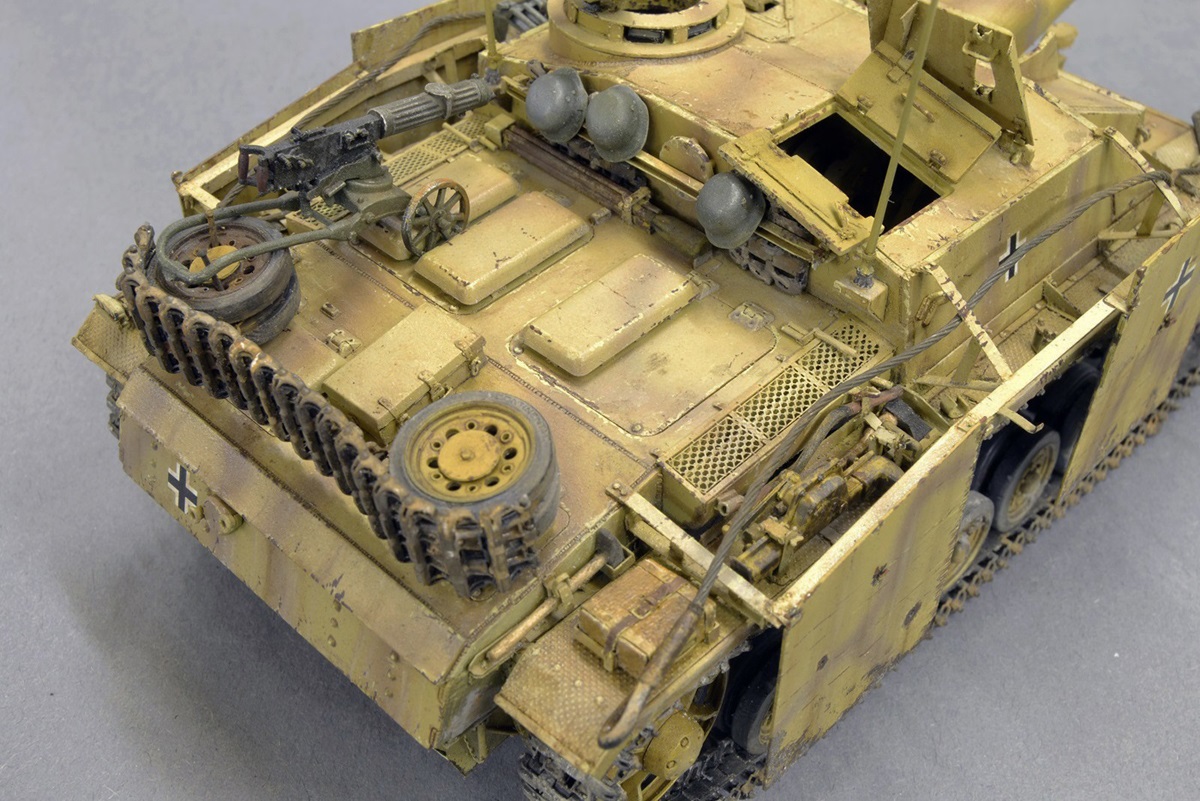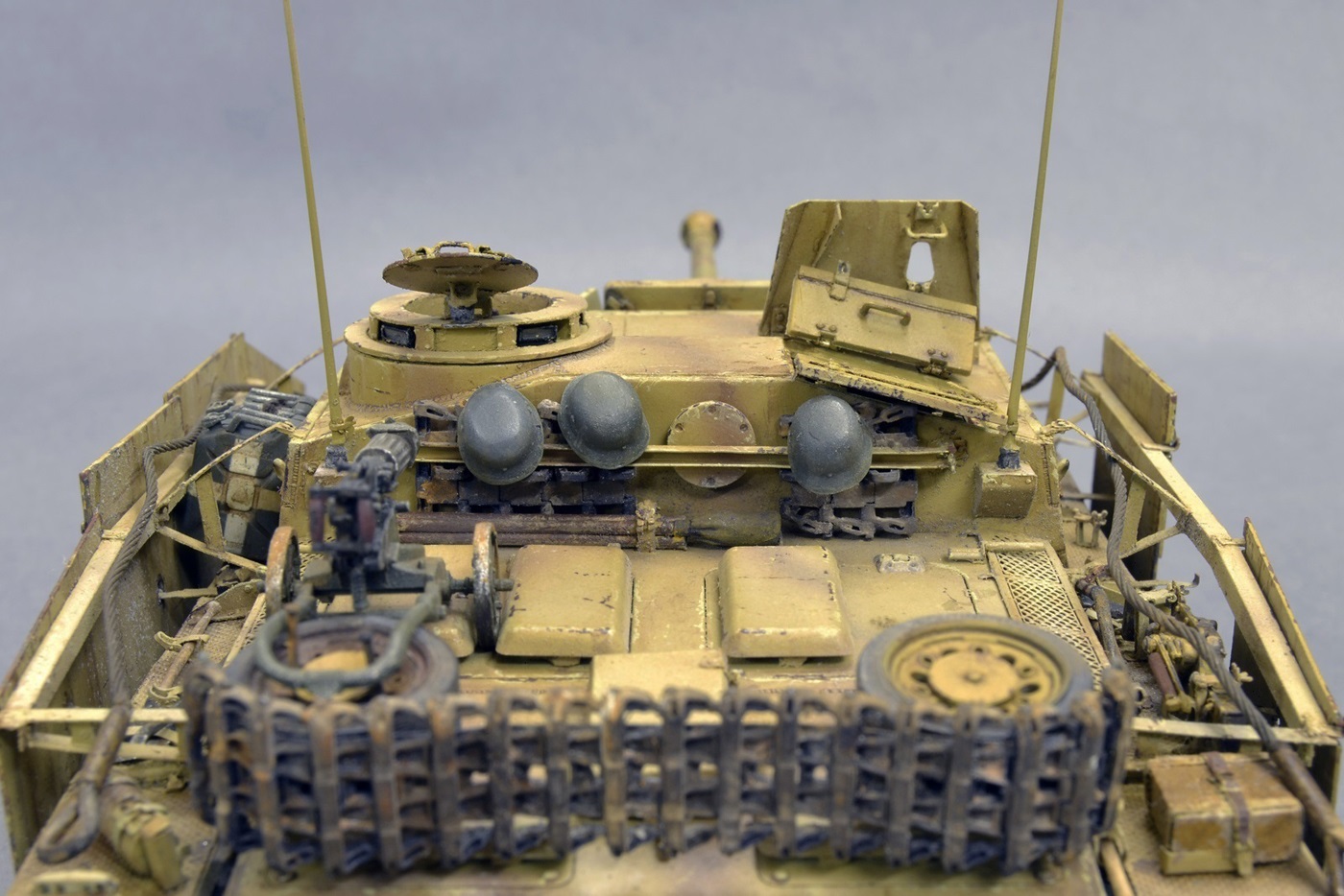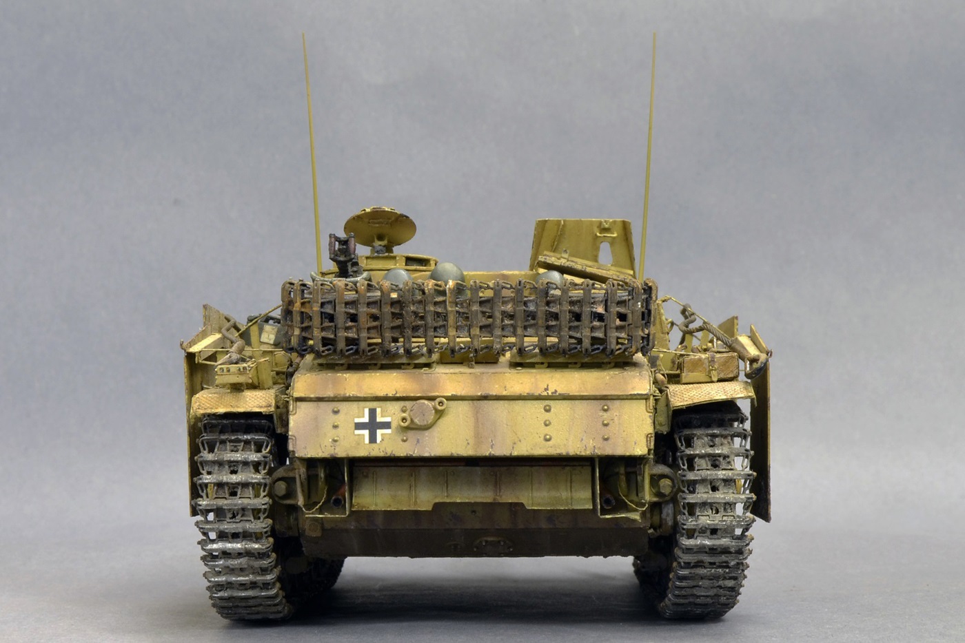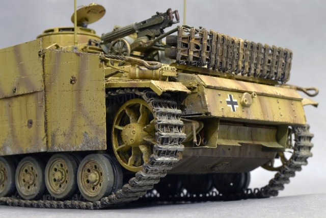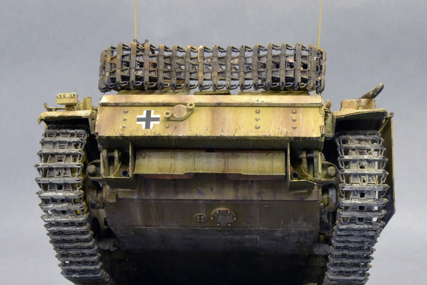 спасибо, зап.траки прикручены проволокой к гребням через катки, делал по фото, не копчу стволы, мой бзик)), гусеница и подвеска рабочии, при фотографировании не уследил и не поправил, вот и играет, я облой обычно убираю под увеличительным стеклом, но тут проглядел слева на конце ручке-дуге, осталась небольшая полосочка, вообще "максим" от звезды так себе, не копиен и много облоя, как понять много жёлтого? дюнкельгельб-это и есть тёмный жёлтый, тут уж ничего не поделаешь, много синего не получится)), вы описание повнимательнее почитайте, например вот это " машина выпуска ноября-декабря 1943г. так сказать мид со всеми вытекающими, а именно-литая маска (устанавливалась с ноября 43г, сварные тоже ставились до конца производства), поддерживающие цельнометалические ролики (с ноября 43г., с резиновыми бандажами также ставили до конца производства), крепления экранов раннего образца (изменилось в марте 44г.) отсутствие циммерита (мазали с декабря 43г. по сентябрь 44г.) и т.д., вообще Ausf G самая массовая модификация, и на протяжении всего производства было внесено множество изменений.", чтобы всё это узнать и подогнать модель под временной период я и штудировал литературу, а травление я применил чтобы модель выглядела живее, в самом наборе я косяков не обнаружил