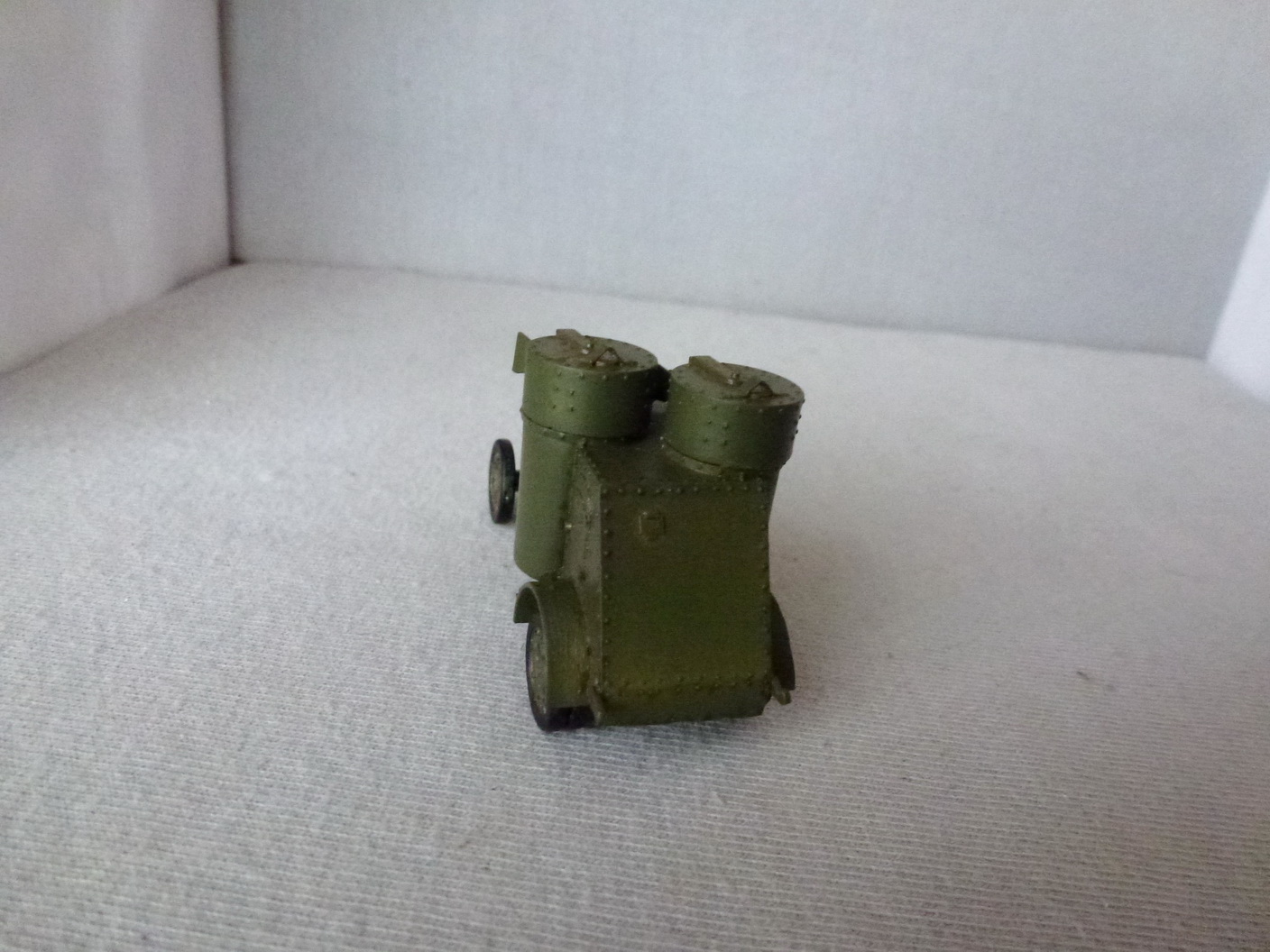 Что сделано - башни выровнены(нижний срез), заменены стволы на шприцевые, пришлось применить инсулиновые 0,4мм, добавлены усилительные планки снизу на защитных кожухах стволов. Передний мост восстановлен ПРЯМЫМ методом - вырезаны пластины рессор, склеены, подвешены на креплениях, добавлена рулевая тяга.Таких машин на сайте нет, на Дише смотрел - там сделаны крылья на переднем мосту.....Не стал делать, они появились после 1924года....а я делал боевую машину...П-образные кронштейны на бортах - это крепления керосиновых ламп....Эльф не делает, хотелось бы увидеть керосинки в 72м!!!! Изготовил тяги открытия защитных створок радиатора, добавил подножки(обе) ибо они отсутствовали как класс. Окрас баллон Тамия, потом кисть, поцарапал карандашем немного....В конце фото исходного материала и прототипа...Моя вторая смоляная, даже не верил что получилась.