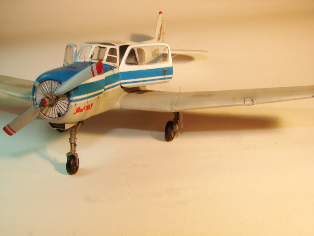Всех приветствую! Завершил постройку модели Як-18Т от «Неомеги» в 48 масштабе. Набор представляет собой модель из смолы. Качество отливок мне не понравилось, не смотря на то, что практически отсутствуют раковины очень много сколов смолы, которые приходилось наращивать пластиком и заливать суперклеем, а потом шкурить и полировать. Сходимость деталей отвратительная. Приходилось делать вставки из пластика для заполнения щелей. После сборки фюзеляжа убирал кручение в кипятке. При сборке использовал металлические штифты. Для устойчивости модели под капотом вклеено 25 грамм свинца. Все стойки просверлены вдоль сверлом 0,6 мм и усилены проволокой от скрепок. Штоки сделал из наконечников, купленных в электротоварах. Как то в наборе совсем отсутствуют выхлопные патрубки, которые я сделал из тех же наконечников. Набор предлагает два варианта дверей – закрытые и открытые. Я сделал обе открытыми, так как при закрытых дверях были очень большие щели между фонарем и дверями. Закрытые двери были вырезаны бормашинкой. В кабине добавил несколько рычагов, ручки аварийного сброса фонаря, козырьки, ремни на креслах. Фонарь родной зафутуренный, боковые стекла блистерная упаковка. Вся модель огрунтована автогрунтом «Motip». Схема окраски предложенная производителем соответствуют самолету летно-технического центра «АВИАТЕХ» 1999 – 2003гг. В инструкции при указании цветов отсутствуют какие-либо привязки к стандартам, поэтому оттенки могут отличаться от оригинала. Красил эмалью Mr.Color. Далее слой футуры, декали, снова футура, затем смывка Звезда-вода-фейри, потом полуматовый лак Mr.Color, масло с пиненом и лак Mr.Color.