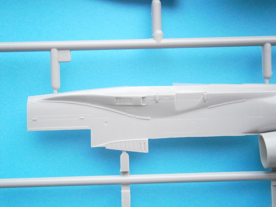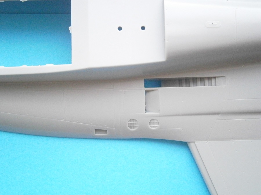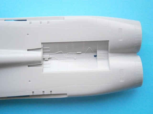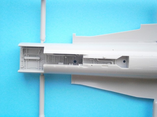 Фюзеляж состоит из двух половинок, имеет довольно хороший тоненький крой, также выделены технологические и эксплуатационные лючки и заклепочные швы.