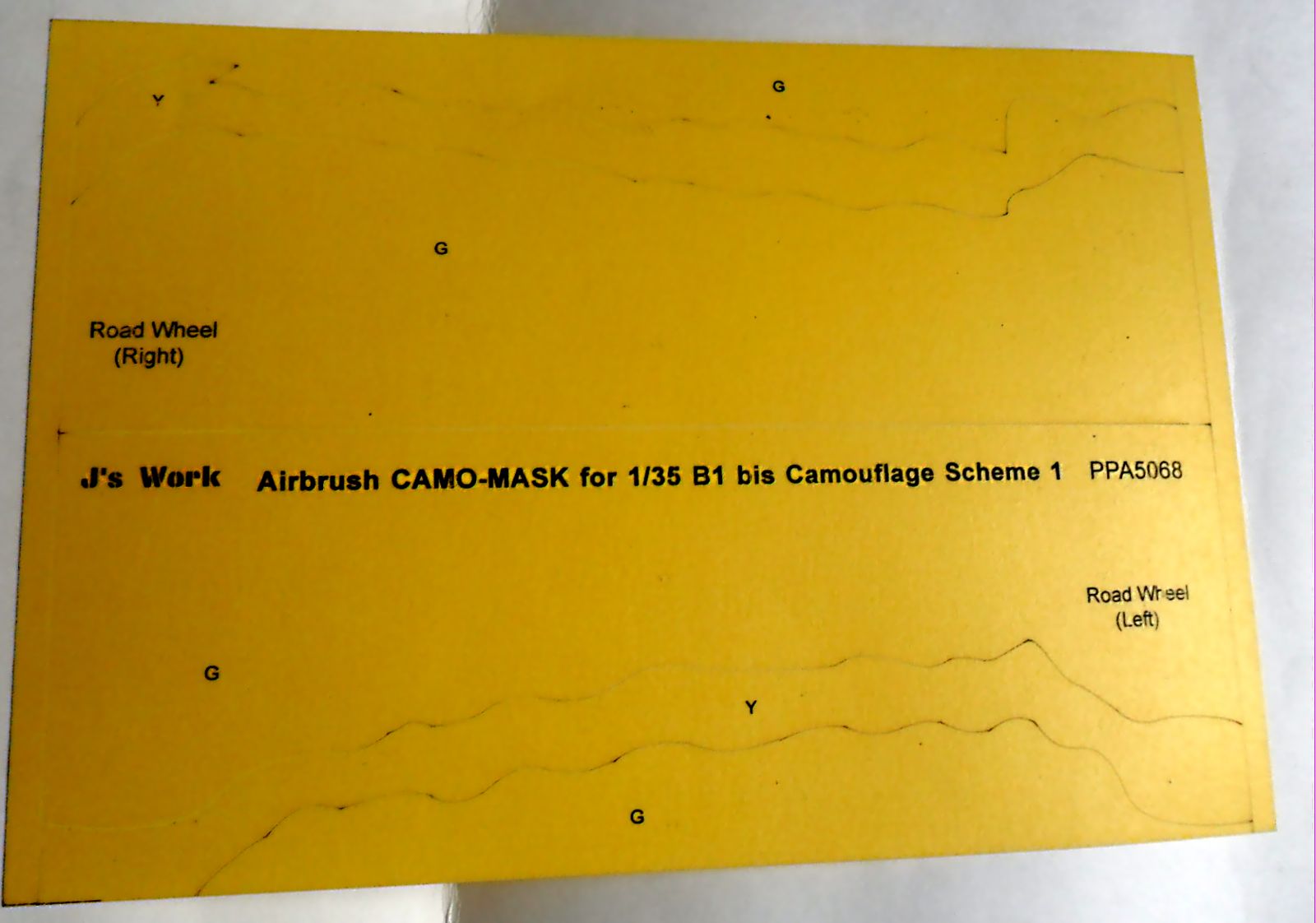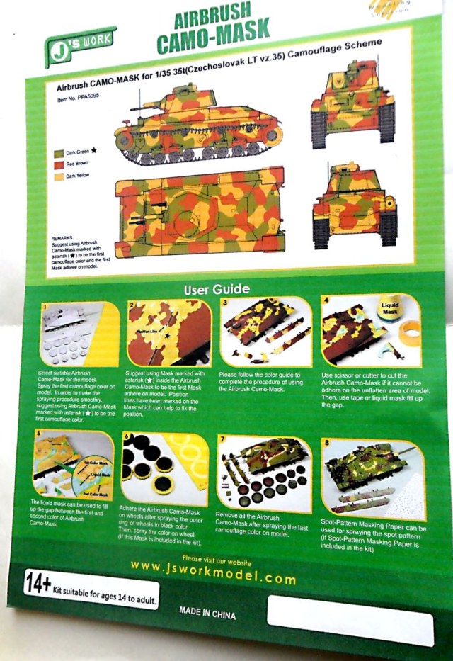 Каждый набор упакован в пакетик-файл. Первый лист - рисунок камо образца техники со схемой нанесения, цветами элементов и рекламой других видов масок. Дальше идут сами маски. Контуры пятен нанесены на желтую самоклеющуюся бумагу, которая имеет толстую подложку. На контурах имеются поясняющие обозначения цветов и направлений наклеивания, мест размещения пятен (борта, корпус, верх и т.д.).