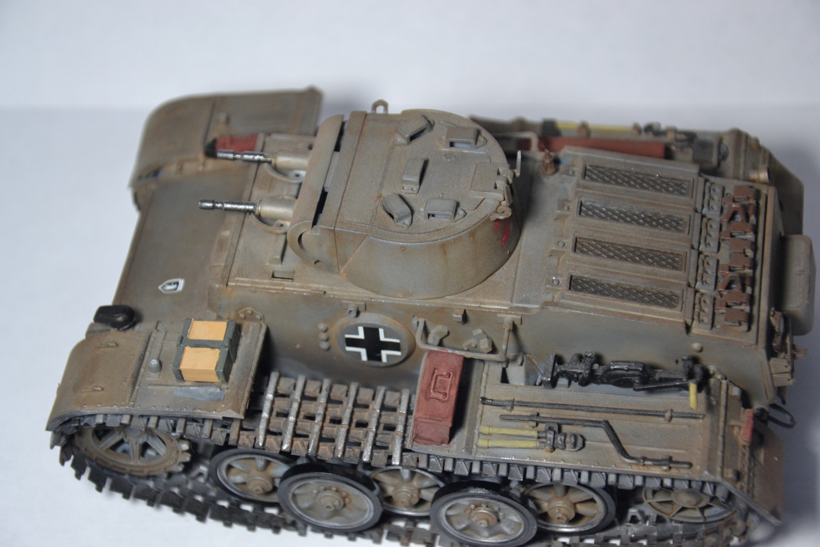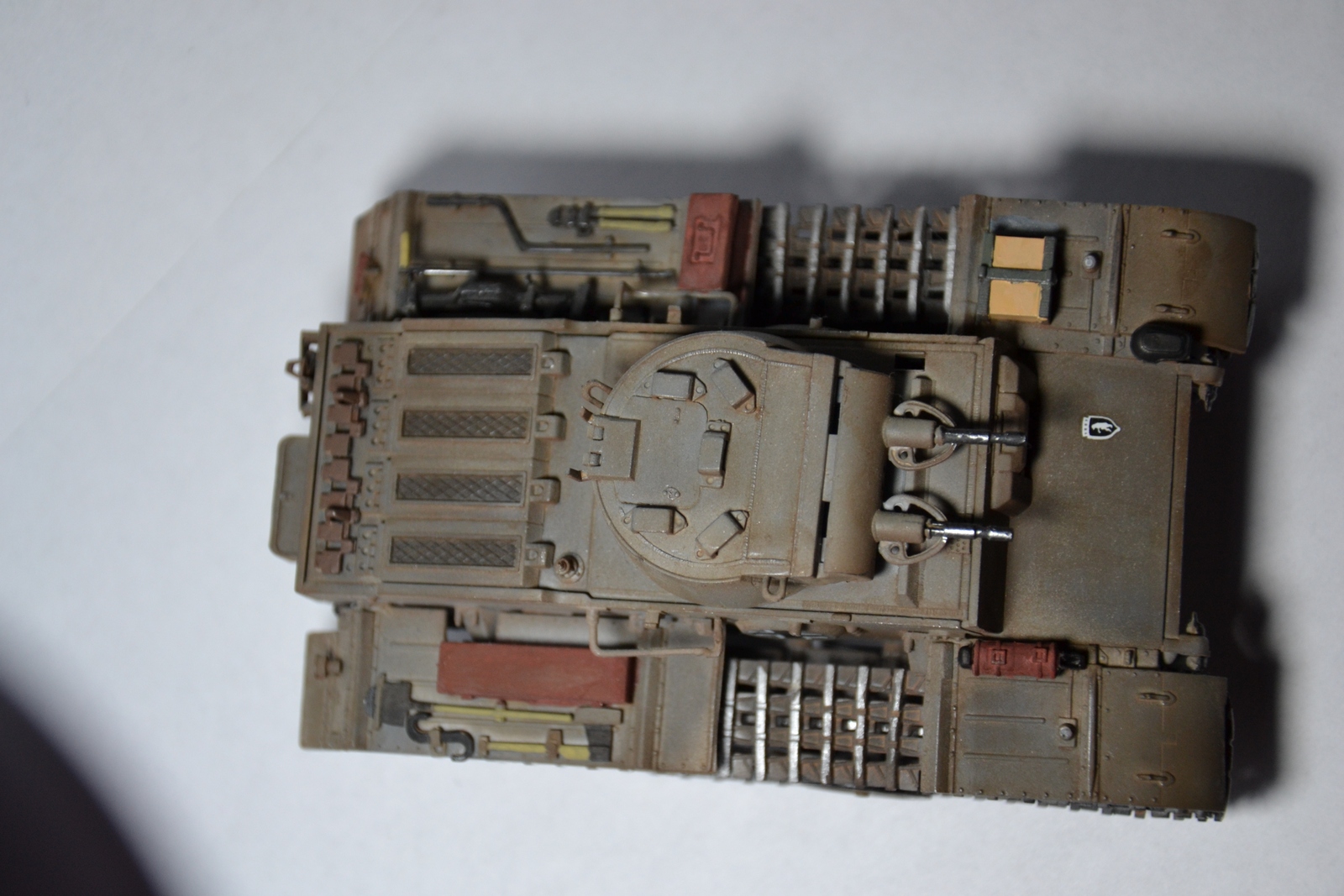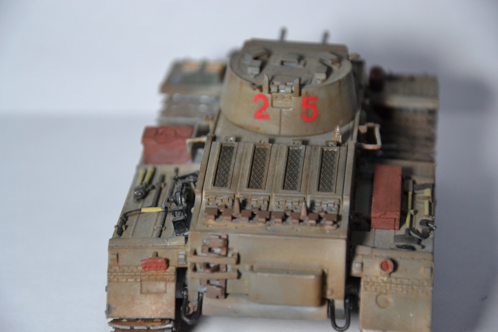 Нужно внимательней изучать инструкцию и фото прототипа, тогда и конвойные огни со стоп-сигналами правильно приклеены будут. Ну и шанцевый инструмент лучше наверное по отдельности красить, а потом на модель навешивать, аккуратнее будет.