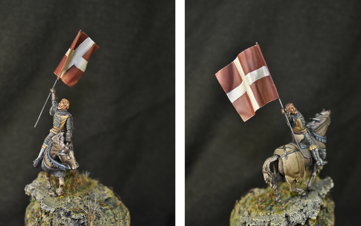 Авторская скульптура Александра Гусева, изображает Вальдемара - короля Дании. Окрашено акрилом Valejo и Citadel. Масштаб 1/72. Подставка самодельная, пробковое дерево, текстурная паста, кварцевый песок и пр.материалы.