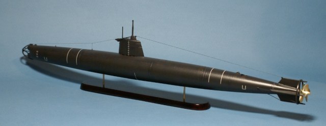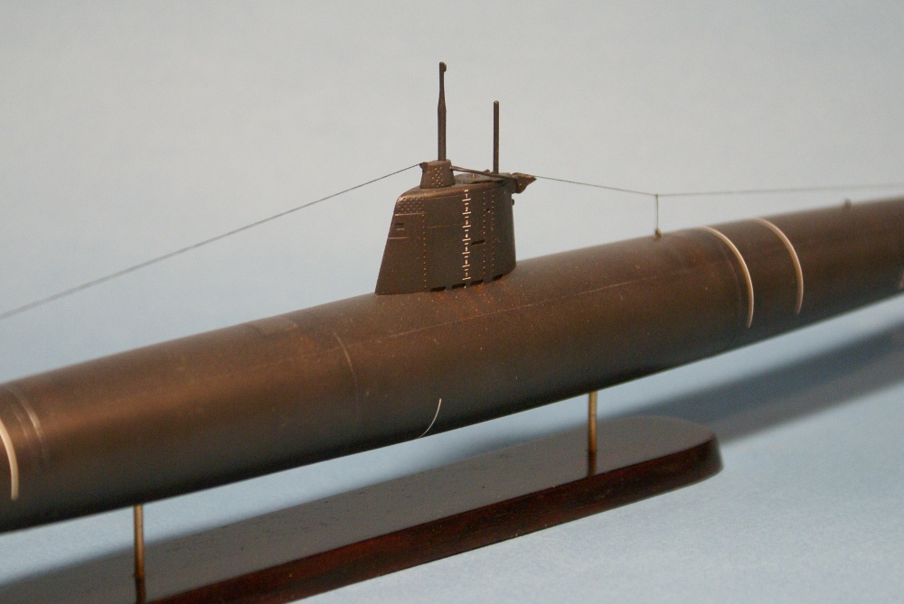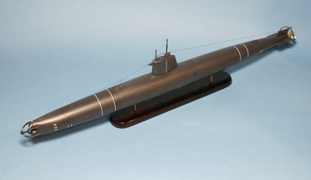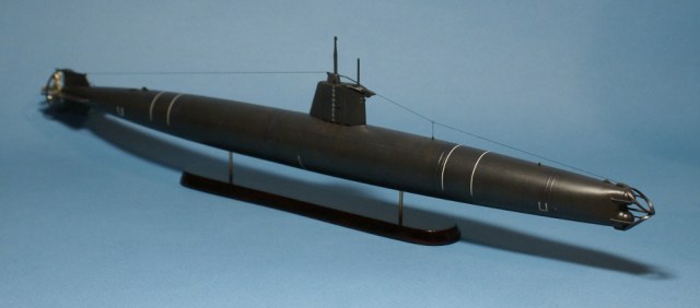 Сам набор весьма неплохого качества, ни следа облоя и утяжин, очень похож на тамиевские модели. Сборка прошла быстро и без проблем, только заменил "тяги" к рулям на проволочные, и сделал ограждение рубки также из проволоки. Кроме того, пришлось изрядно обточить деталь ограждения торпедных аппаратов, так как оригинальная деталь мне показалась несколько грубоватой. Окраска и тонировка такой темной, почти черной модели изрядно потрепала нервы. Начал с прешейдинга черным, потом основной цвет, выступающие люки покрасил более светлым цветом по методу цветомодуляции, затем тонировка и везеринг масляной краской. Тросики сплел из ниток из капронового банта.