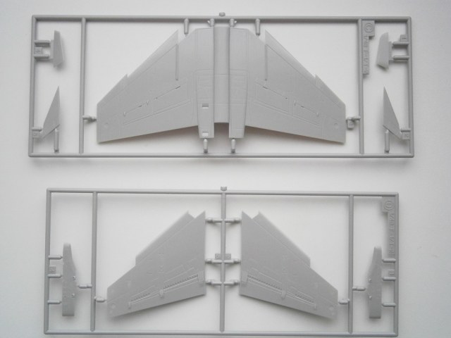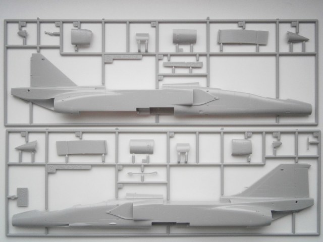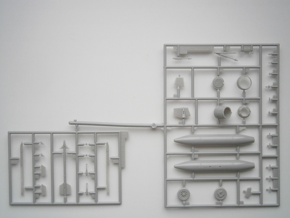В красочной картонной каробке находится четырнадцать литников светло- серого цвета с деталями модели самолета и один литник из прозрачного пластика это остекление фонаря кабины пилота и БАНО.