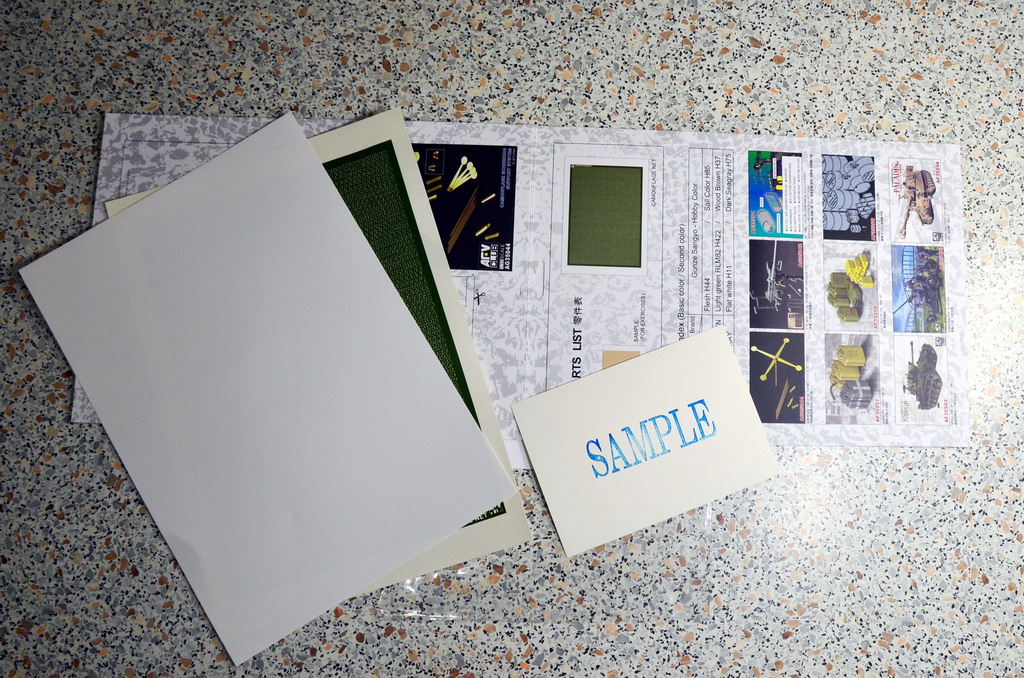 Упаковка представляет собой сложенное вдвое картонное основание формата А-4. На лицевой стороне изображена цветная картинка с рисунком двух типов сетки и способ её применения. На обороте – инструкция. На одной из внутренних сторон – шаблоны для изготовления рамки (метод применения указан в инструкции), на другой – цвета применяемой краски и анонсы новинок AFV.