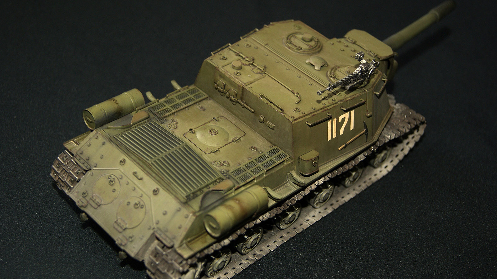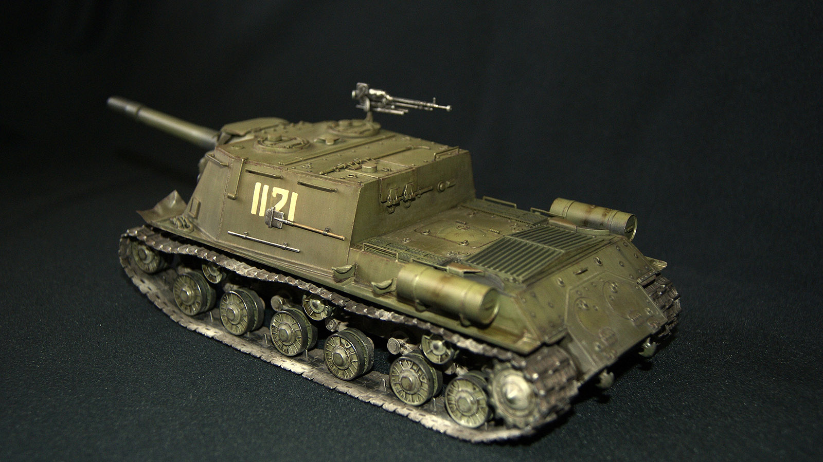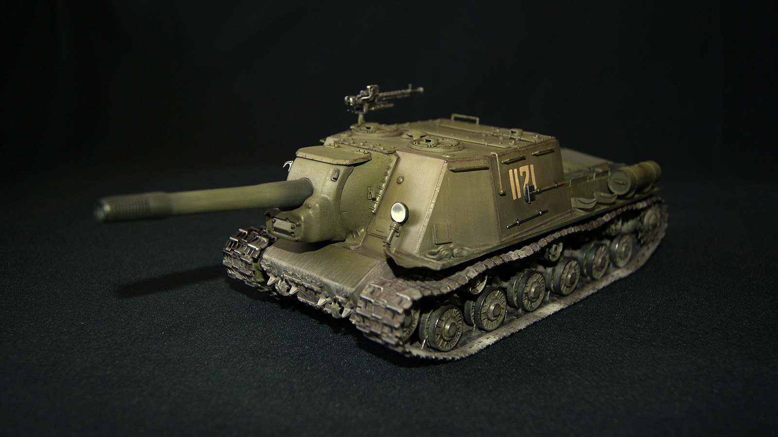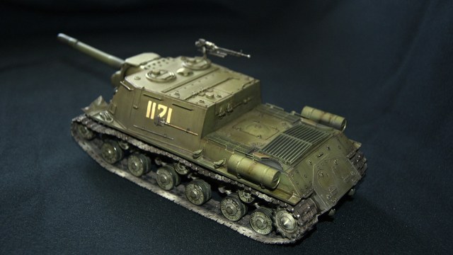 ИСУ-152 (Объект 241) — третья моя собранная модель. В матчасть сильно не лез, и так долго звезду пилил. Из дополнений траки от ВЭ, решетка МТО (пластик доширак ), фара Эльф. Окрас акрилом ганзы (намешал из рлм), тонировка маслом и фильтрами MIG, смывка АК, пигменты Wilder. Сколы рисовал кистью и спонжом акрилом Акана. Вместо декалей вырезал трафарет из скотча и задул номер. Промежуточно наносил сатиновый лак Микроскайл. Модель состарил в духе городских боев, в планах подставка под улицу...