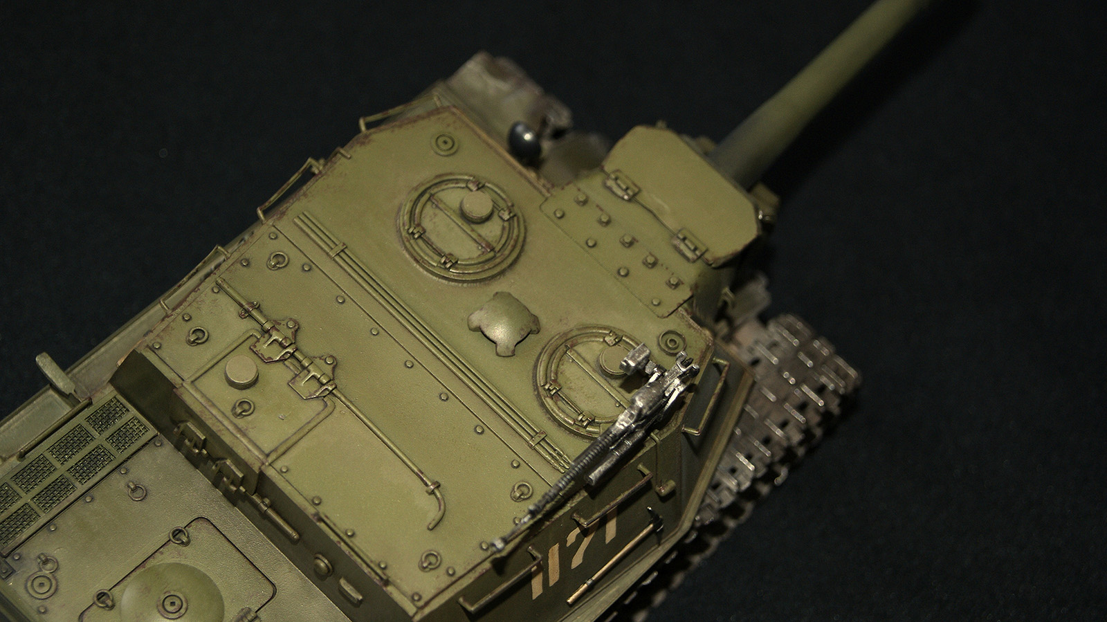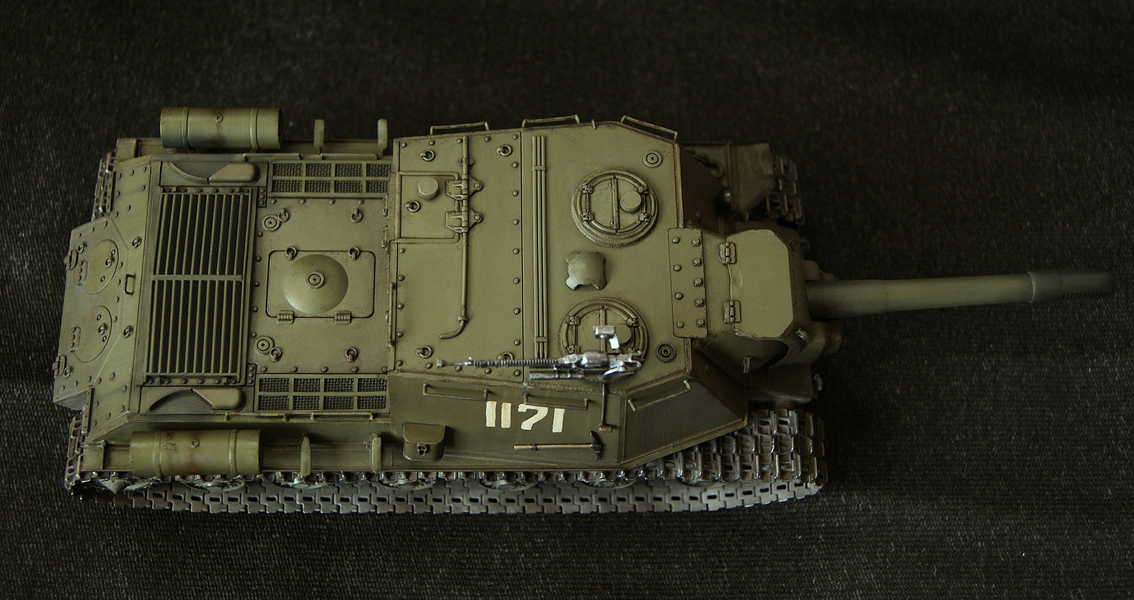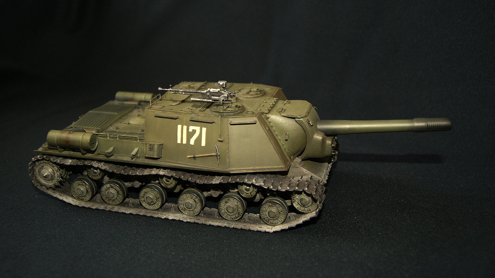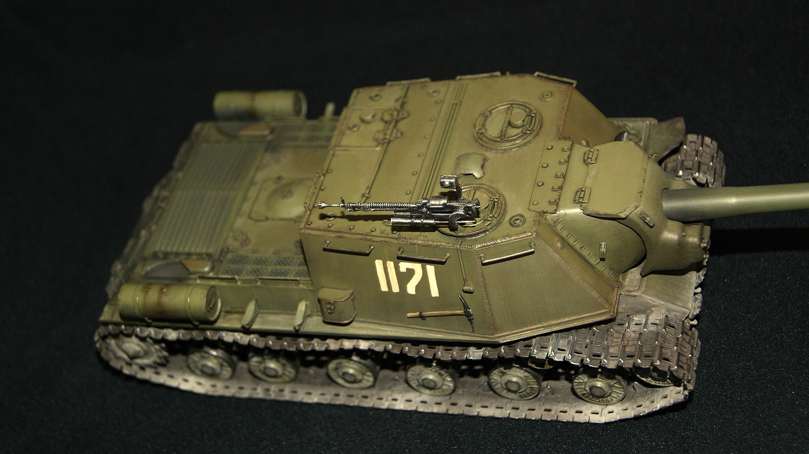 ИСУ-152 (Объект 241) — третья моя собранная модель. В матчасть сильно не лез, и так долго звезду пилил. Из дополнений траки от ВЭ, решетка МТО (пластик доширак ), фара Эльф. Окрас акрилом ганзы (намешал из рлм), тонировка маслом и фильтрами MIG, смывка АК, пигменты Wilder. Сколы рисовал кистью и спонжом акрилом Акана. Вместо декалей вырезал трафарет из скотча и задул номер. Промежуточно наносил сатиновый лак Микроскайл. Модель состарил в духе городских боев, в планах подставка под улицу...