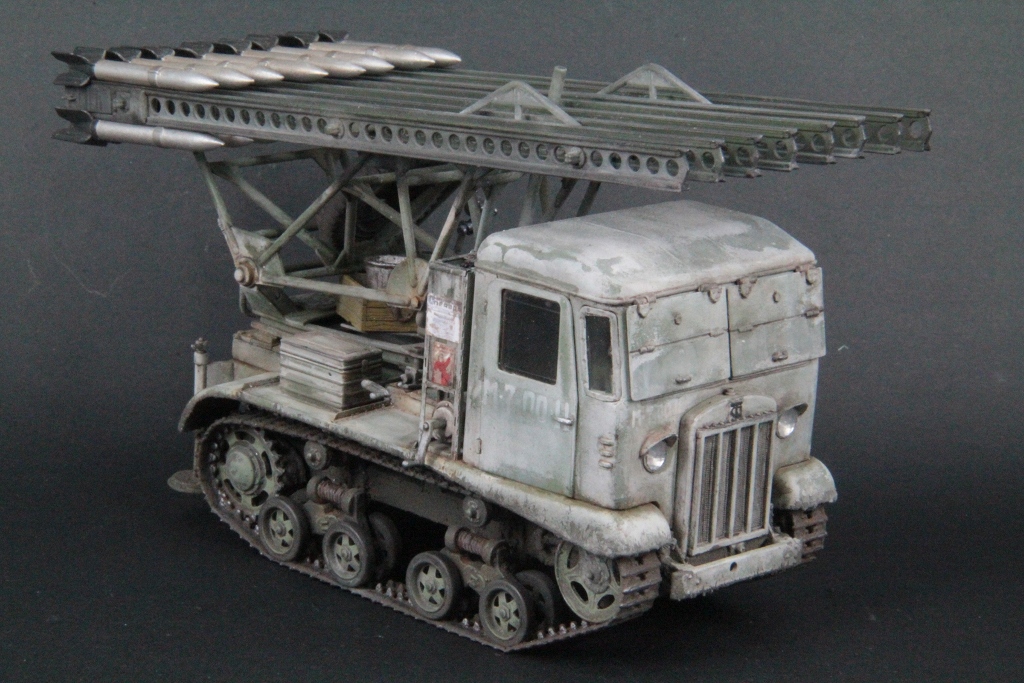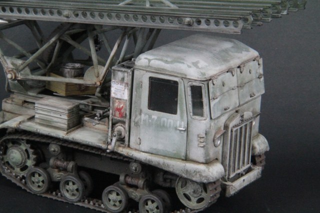 Коллеги представляю на ваш суд вариант Катюши на базе трактора СТЗ-5. Изначально очень хотелось заполучить данный трактор в свою коллекцию и после покупки кита Vulcan и долгих раздумий решился на вариант Катюши, решающим стал момент, что пару стоковых тракторов СТЗ уже на каропке присутствуют. Саму установку заимствовал у ICM, так же заново изготовил топливные баки и всякую мелочевку, так же донором выступили ящики под аккумуляторы, дополнительный бак от Т-34, защита лобовых стекол. Добавлены гофро-шланги, фары поменяны на Эльф. Окрас решено было сделать зимний. Впервые попробовал эмаль Mr. Hobby, остался доволен результатом, но по сравнению с тем же акрилом Тамии, слишком пахнет, дальнейшее использование под вопросом. Для зимнего камо использовался метод лак для волос. Жидкость для этого метода от АК. Белая краска - Тамия разбавленная водой. Грязюка использовалась фирмы Wilder русская грязь. И напоследок данную модель скорей можно назвать - Реплика СТЗ-5 НАТИ БМ-13 Катюша.