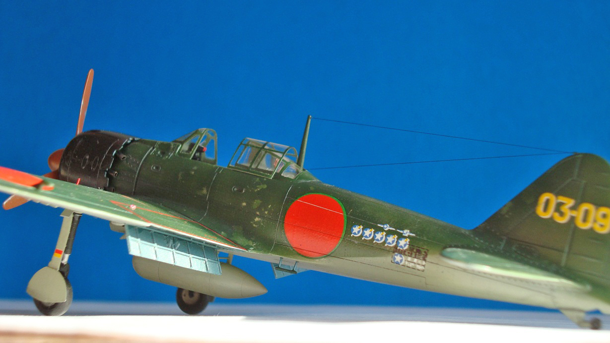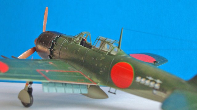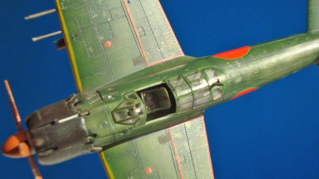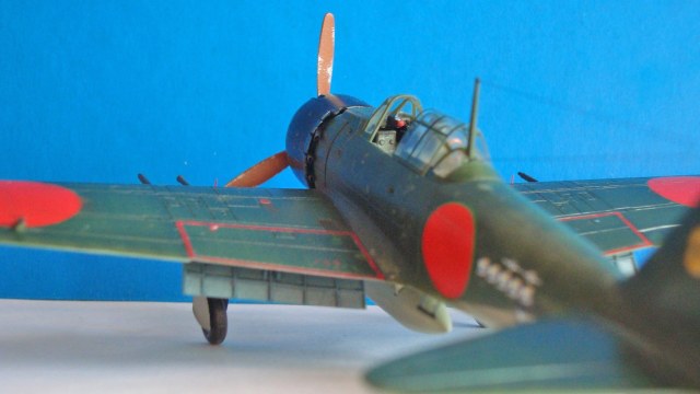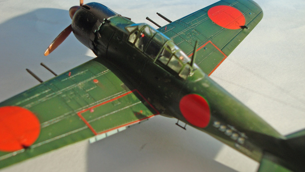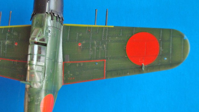 Спасибо. Накраска хиномару усложняется зеленым тонким кантом на верхних поверхностях и фюзеляже. Нанести довольно проблематично, тем более что при задуманных визуальных эффектах одна ошибка легко могла испохабить работу.