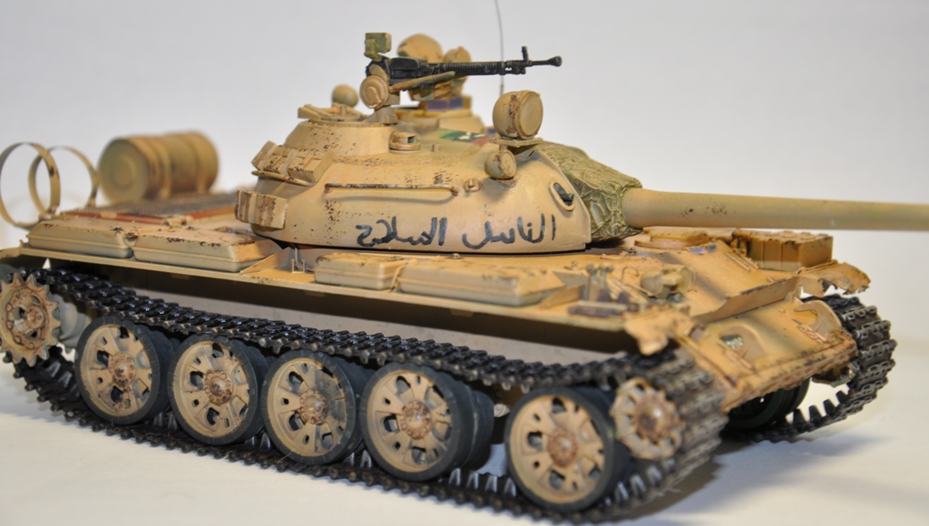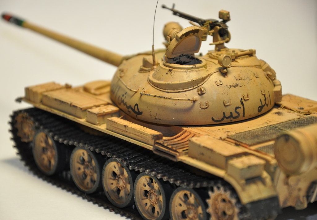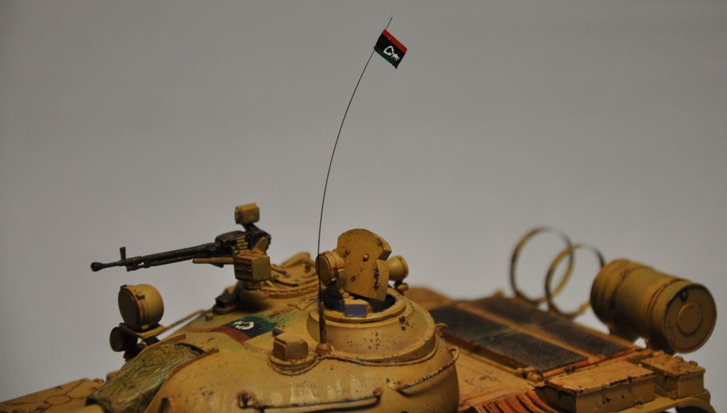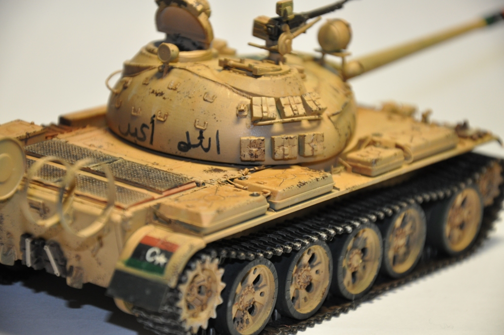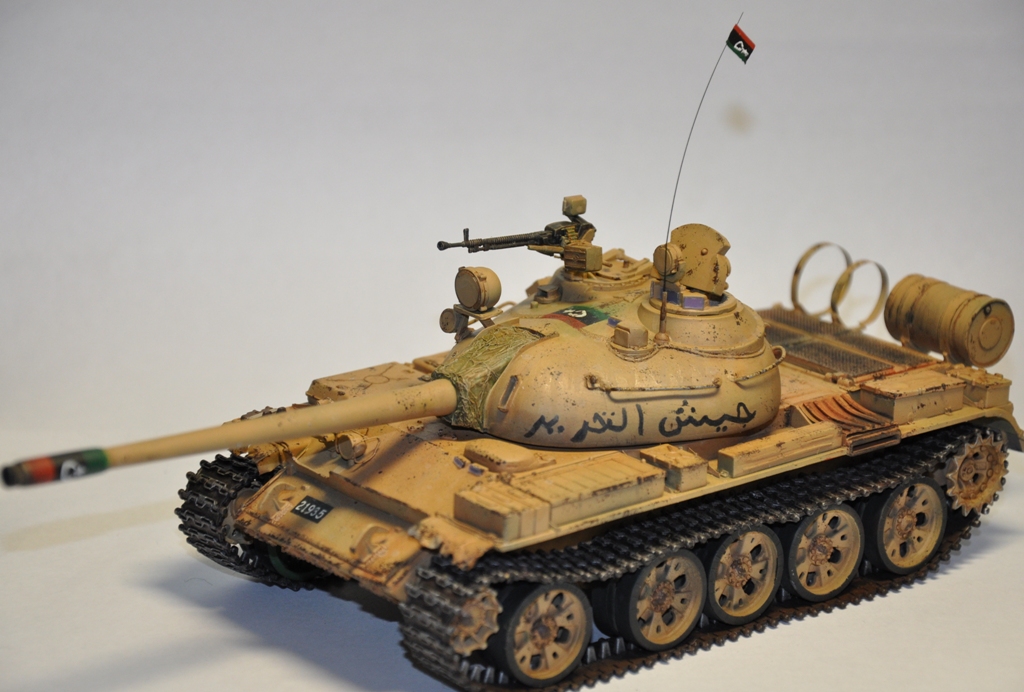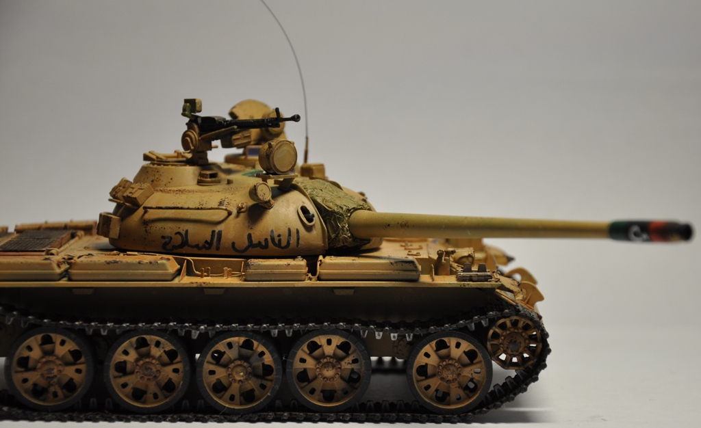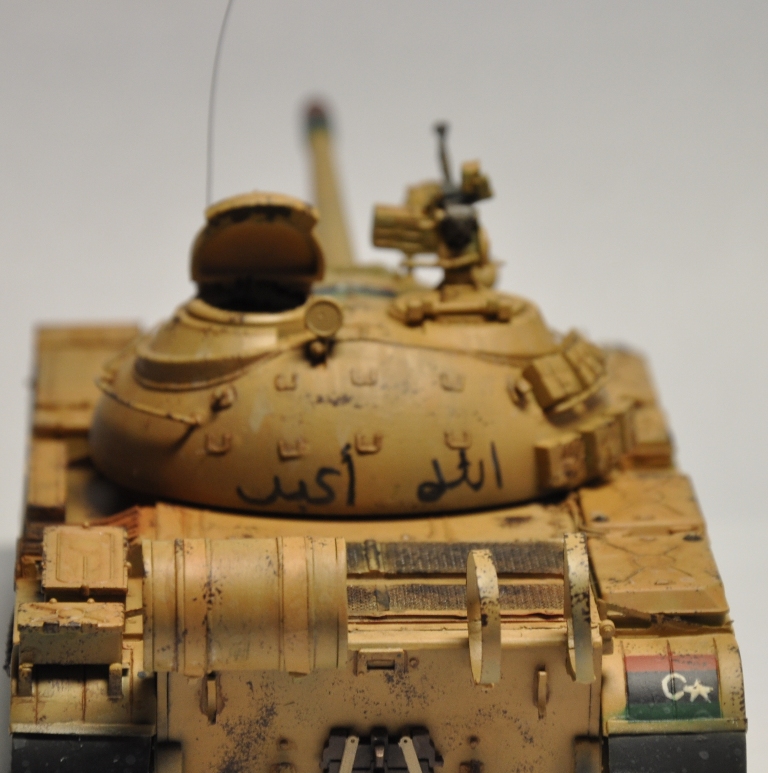 Представляю вашему вниманию танк Т-55А ливийских повстанческих сил. По хронологии его можно отнести к гражданской войне в Ливии во время "Арабской весны". Давно хотел собрать что-то из восточной тематики, долгое время собирал фотографии прототипа, пересмотрел оромное количество видеоматериалов с Т-55А. Данная модель является собирательным образом ливийских повстанческих Т-55. Надпись на левой скуле переводится как "армия освобождения", на правой - "оружие народа", сзади всем известный "аллах акбар" или "аллах великий". Старался нанести как можно больше флагов. Ибо повстанцы очень любили их рисовать везде, где только можно.