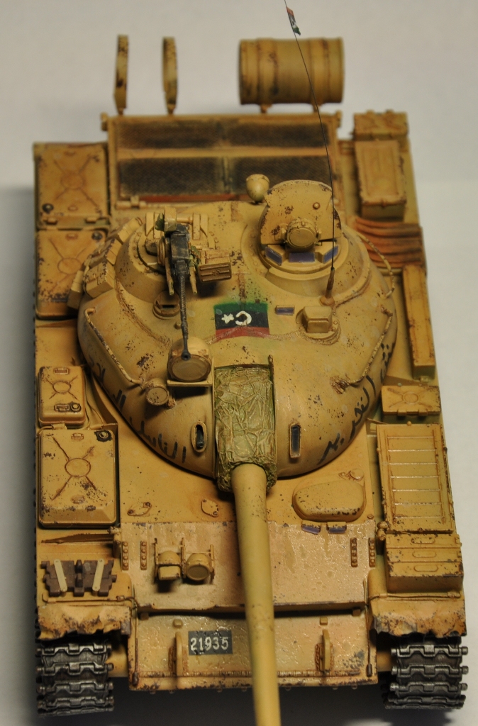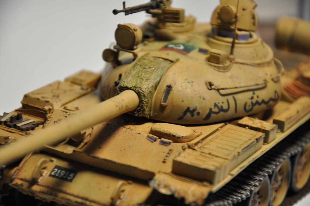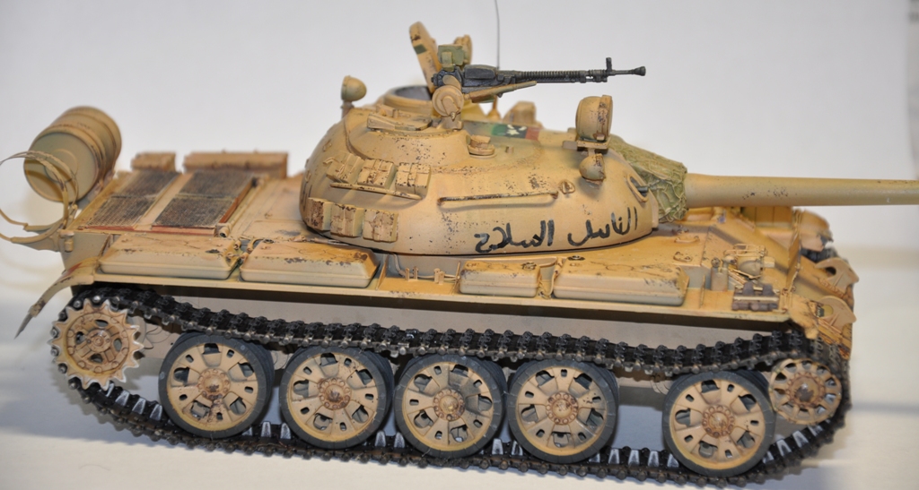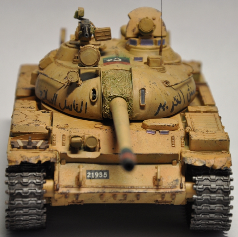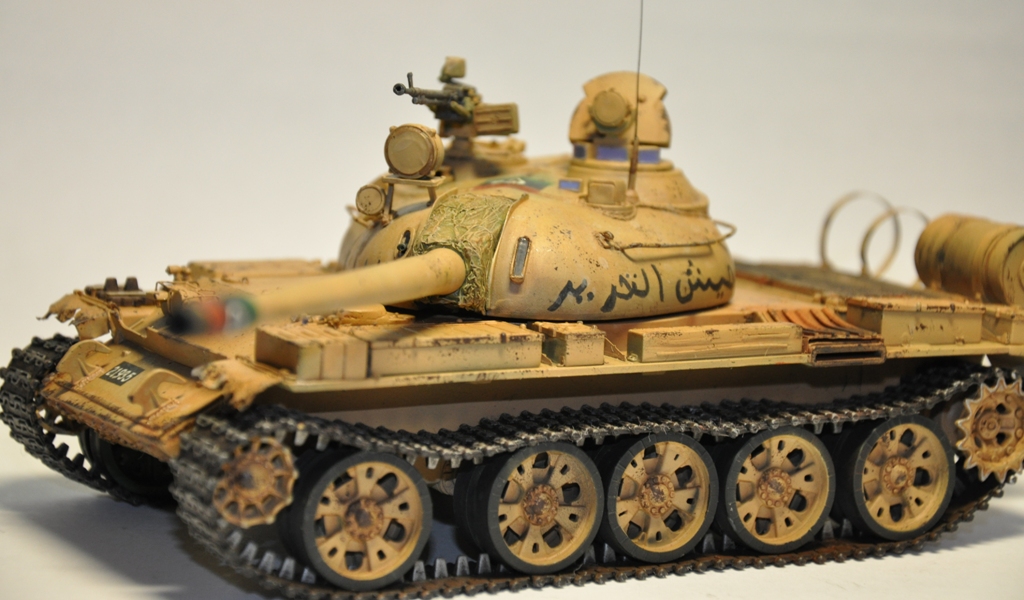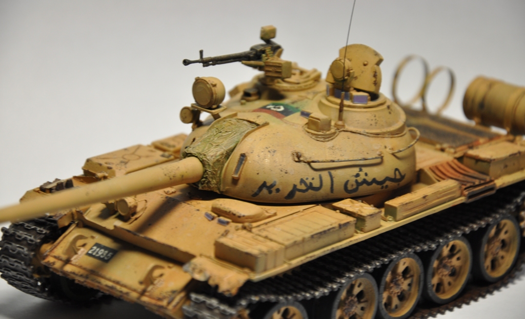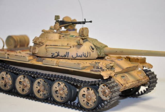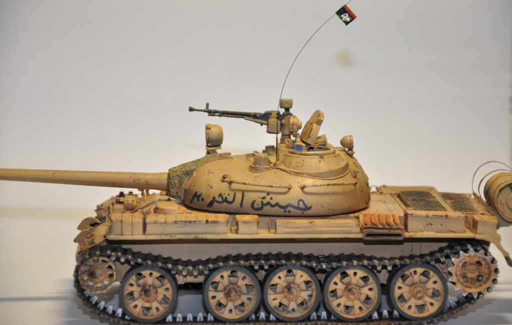 Представляю вашему вниманию танк Т-55А ливийских повстанческих сил. По хронологии его можно отнести к гражданской войне в Ливии во время "Арабской весны". Давно хотел собрать что-то из восточной тематики, долгое время собирал фотографии прототипа, пересмотрел оромное количество видеоматериалов с Т-55А. Данная модель является собирательным образом ливийских повстанческих Т-55. Надпись на левой скуле переводится как "армия освобождения", на правой - "оружие народа", сзади всем известный "аллах акбар" или "аллах великий". Старался нанести как можно больше флагов. Ибо повстанцы очень любили их рисовать везде, где только можно.