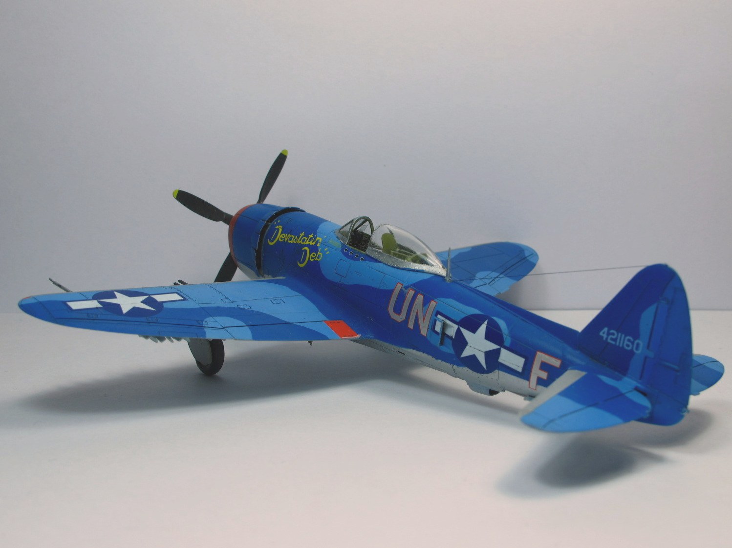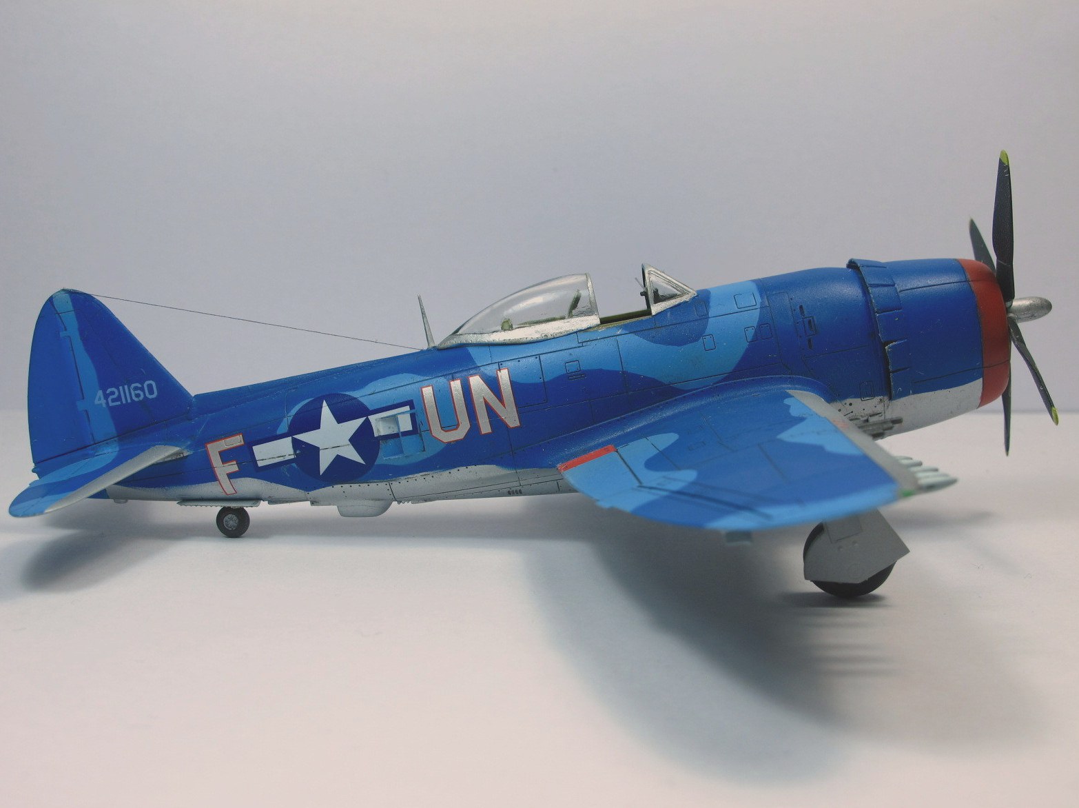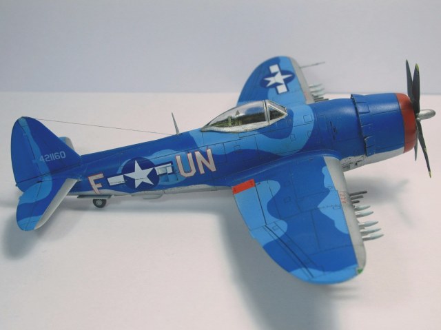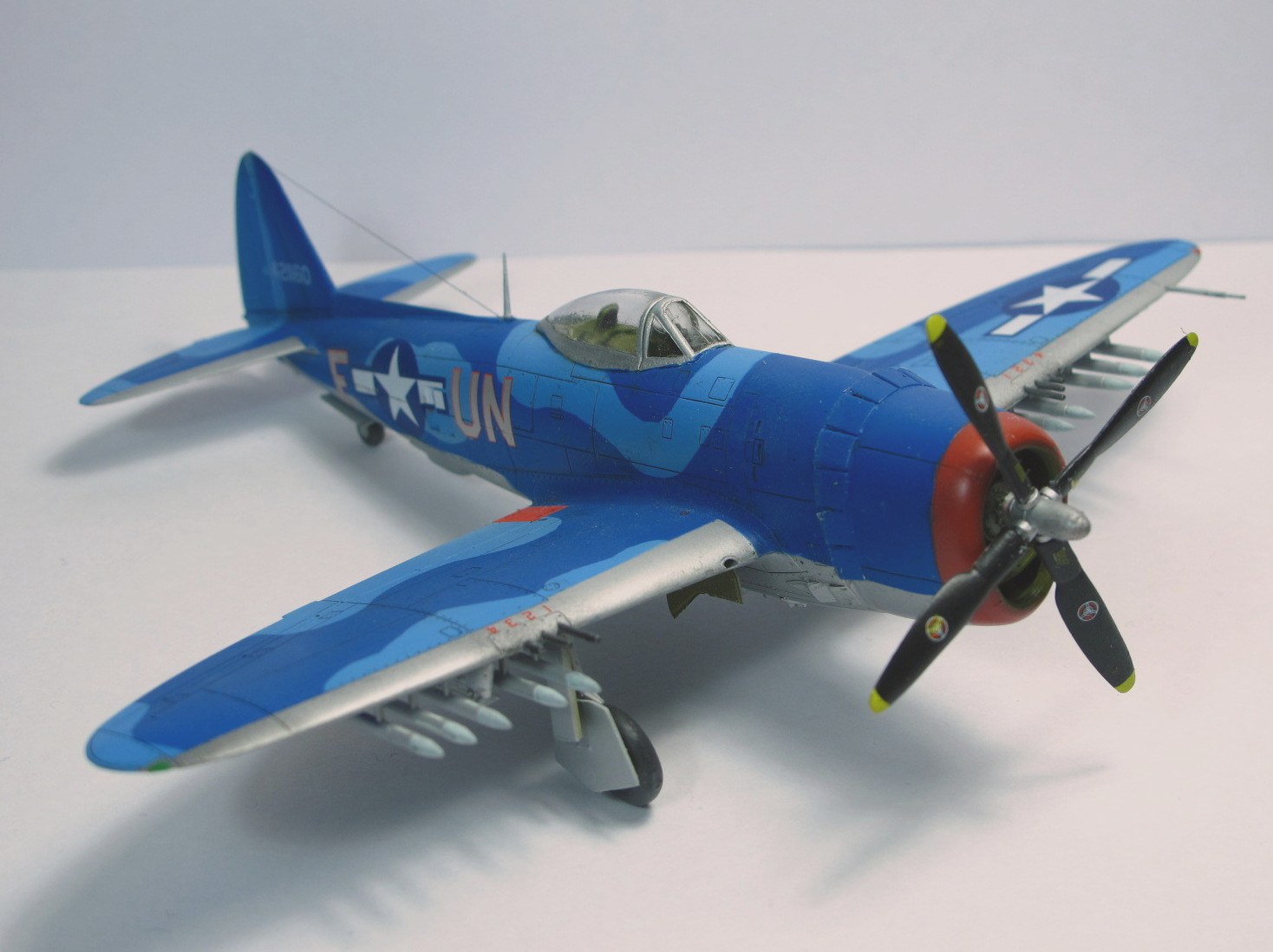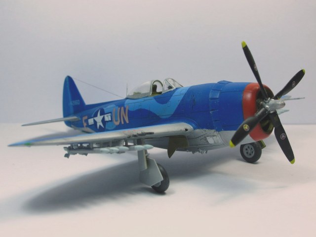 Собирал в пару к другому Тандерболту, D. Очень понравился сине-голубой камуфляж. Модель от набора "D" той же фирмы по сути ничем не отличается: движок, пара деталей, дефекты литья в тех же местах. Сборка из коробки, добавлен только прицел/ремни в кабину и антенна.Фонарь кабины открывается. Красил "Звездой", краски мешал сам из того что было под рукой. Получилось симпатично (на мой взгляд), но ярковато.