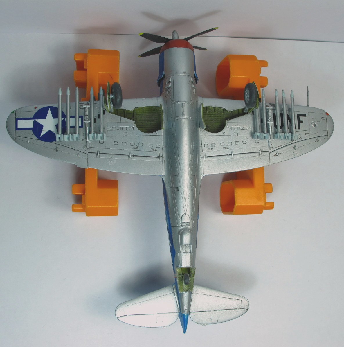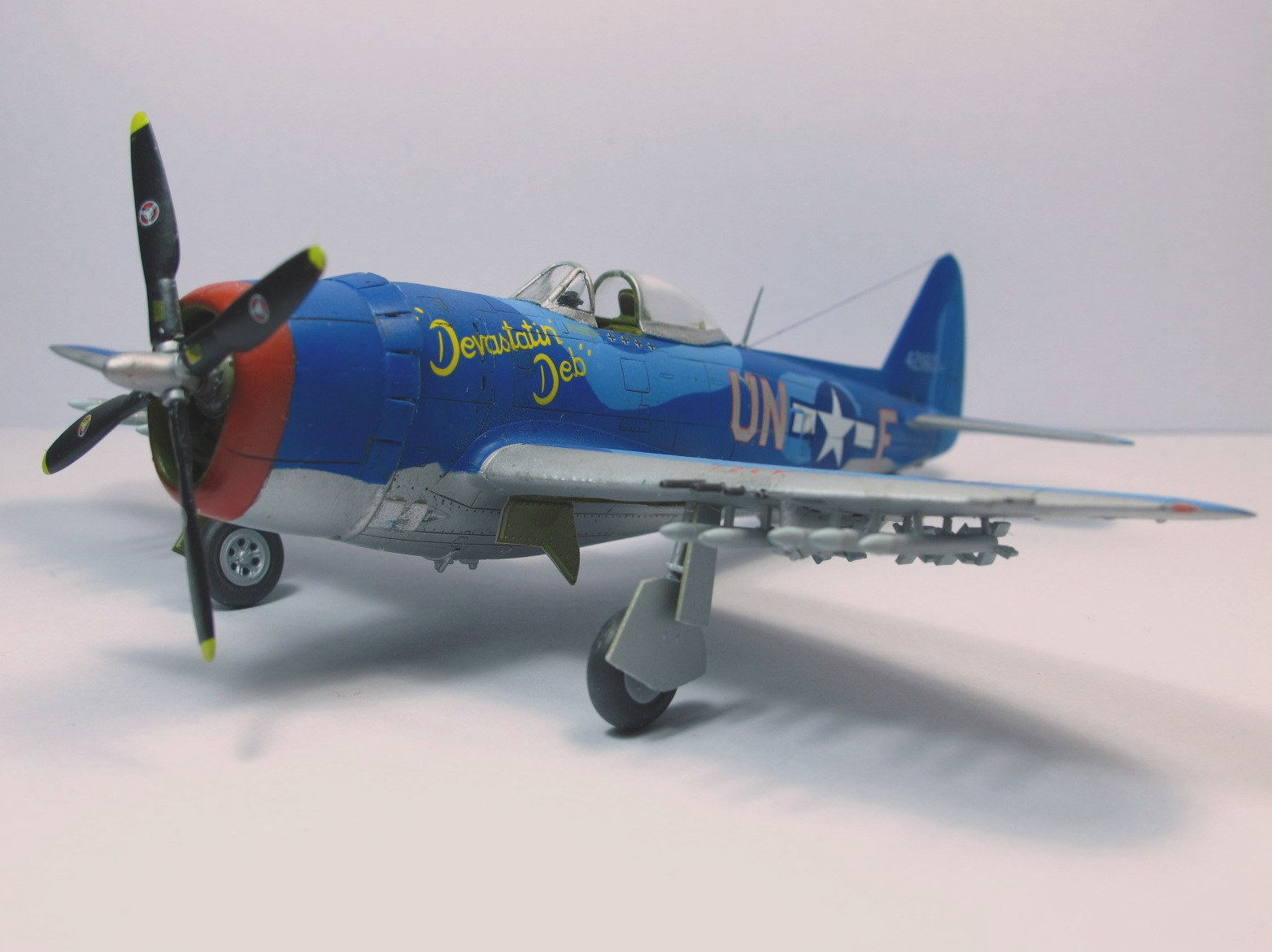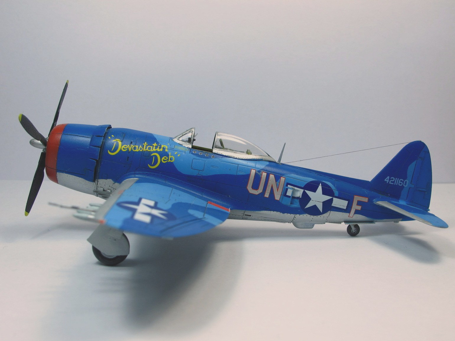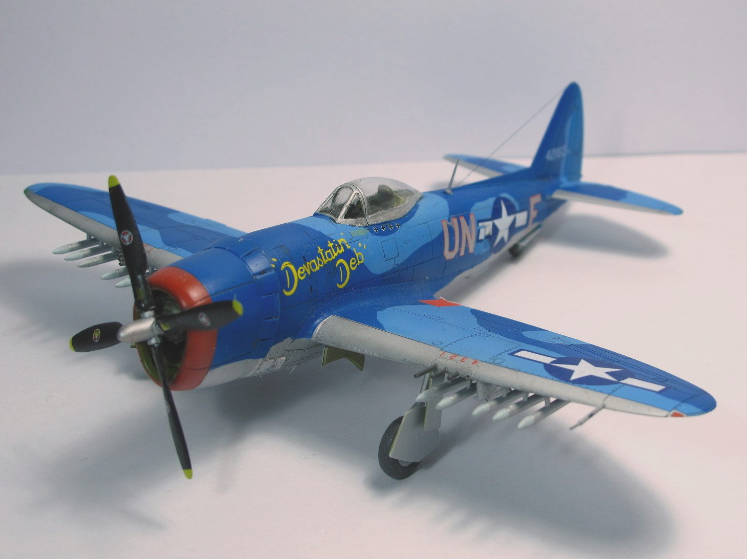 Собирал в пару к другому Тандерболту, D. Очень понравился сине-голубой камуфляж. Модель от набора "D" той же фирмы по сути ничем не отличается: движок, пара деталей, дефекты литья в тех же местах. Сборка из коробки, добавлен только прицел/ремни в кабину и антенна.Фонарь кабины открывается. Красил "Звездой", краски мешал сам из того что было под рукой. Получилось симпатично (на мой взгляд), но ярковато.