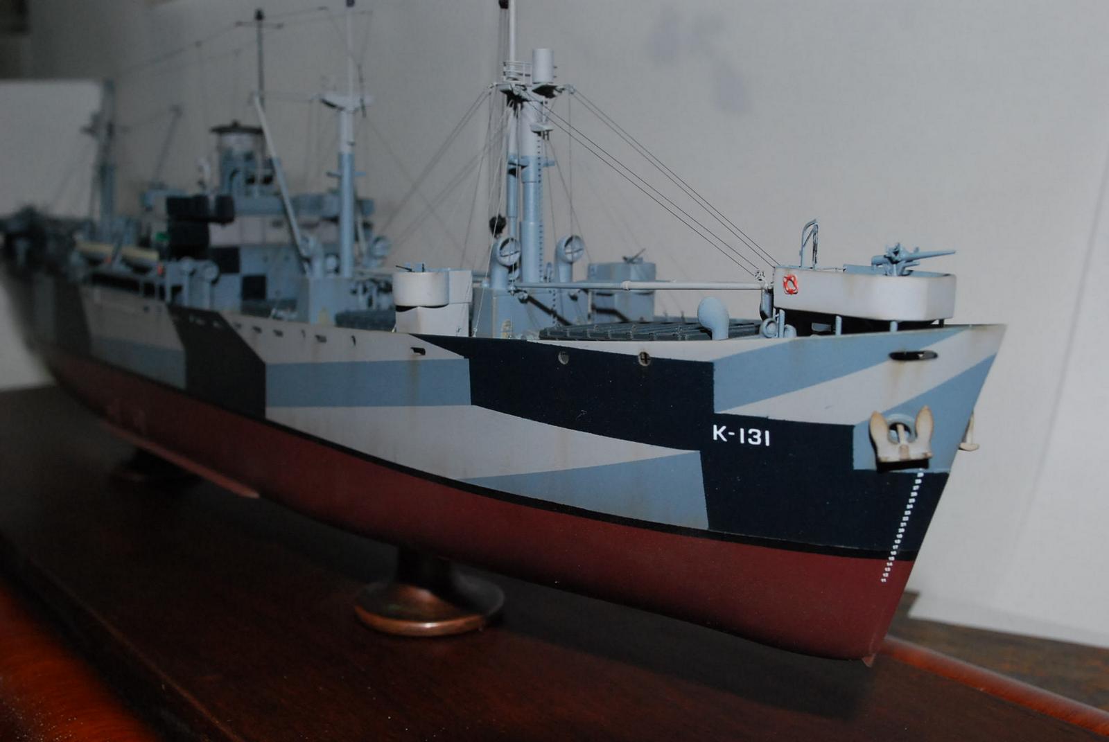 Модель от Трумпетра собиралась в принципе не плохо, конечно без шпакли не обошлось но у трубача есть наборы и гооораздо хуже этого. Пластик был дополнен травлением от GMM, мастеровскими эрликонами и пушку пятидюймовку я поставил от Хасегавовского эскортного авианосца. Кое что пришлось доделать самому (радиомачту возде трубы, наблюдательный пост в виде вышки. Такелаж бантик.