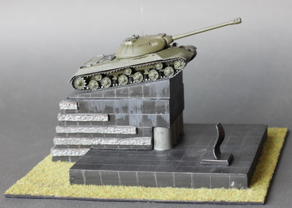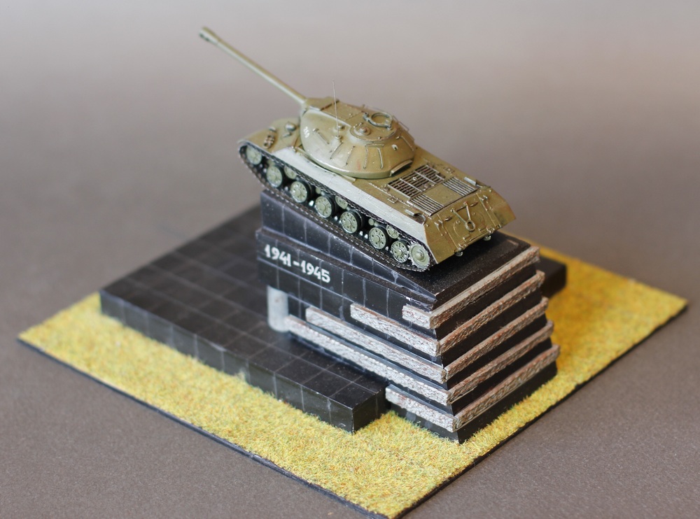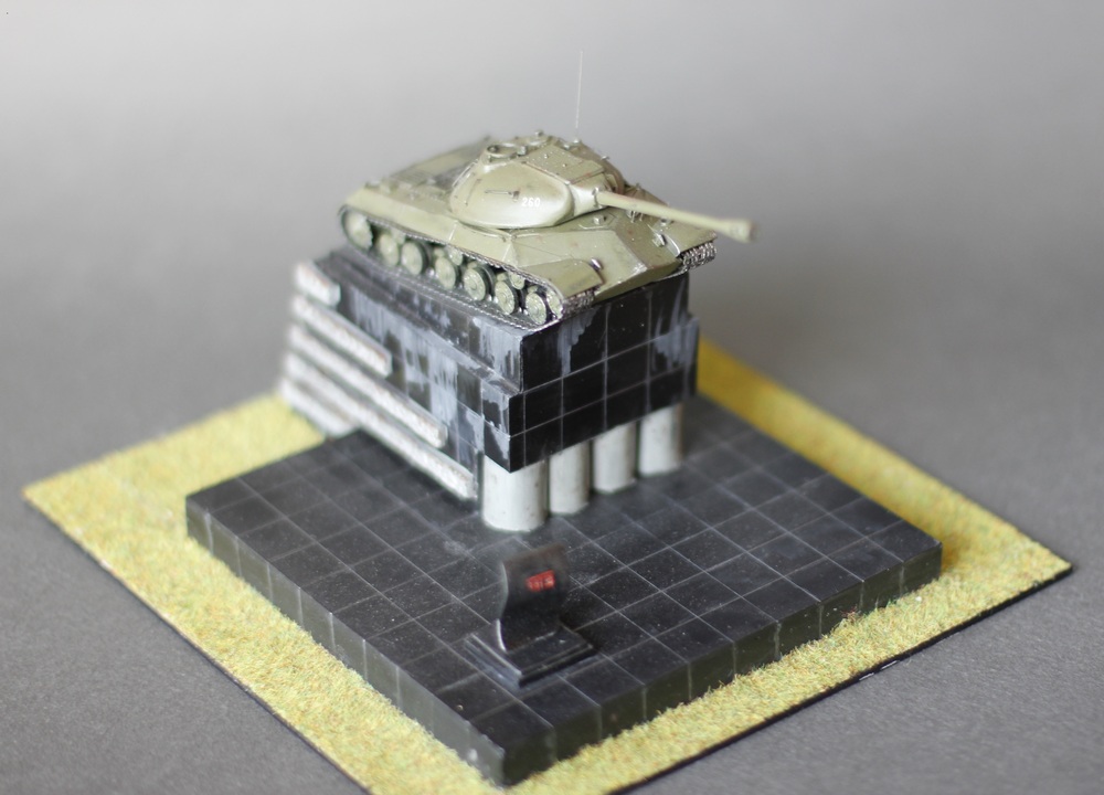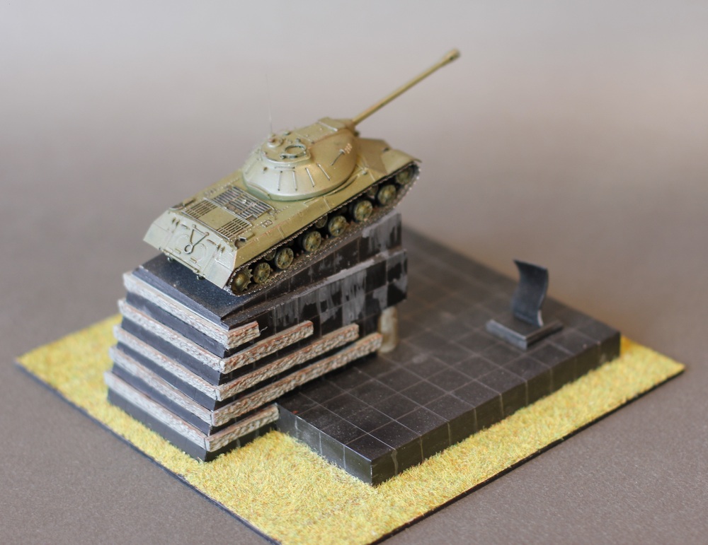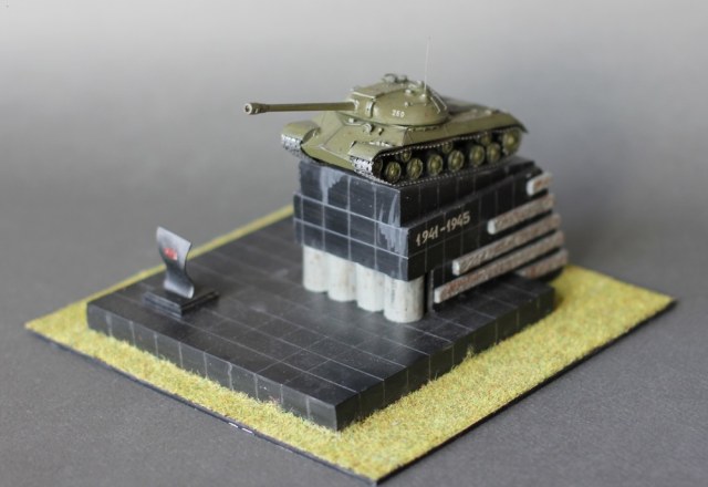 Здравствуйте Коллеги. Диорама или скорее виньетка "Танк на площади". Те из вас кто бывал в Челябинске наверняка видели этот памятник на Комсомольской площади. Танки не моя тема, но мимо этого шедевра я пройти не смог. На мой взгляд это один из красивейших танков мира и один из символов моего города. За исходник был взят набор от Родена в 72м масштабе. Основание из оргстекла. Трава от "Звезды". Размеры постамента соответствуют масштабу - лазил по памятнику с рулеткой. Единственное не соответствие - отсутствие надписе на фасаде памятника, но в таком виде он тоже был, так что историческое соответствие имеет место быть. Красилось всё акрилом от Тамии и полуматовым лаком от неё же. Потёки на постаменте результат атмосферных осадков (На оригинале) . Из дополнений поручни из струны, фара Эльф, Гусеницы травление от АСЕ. На последнем фото оригинала. Приятного просмотра
