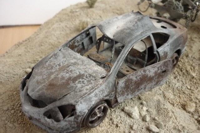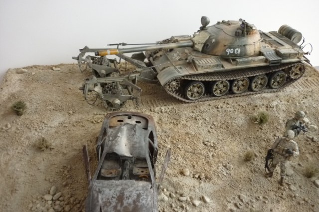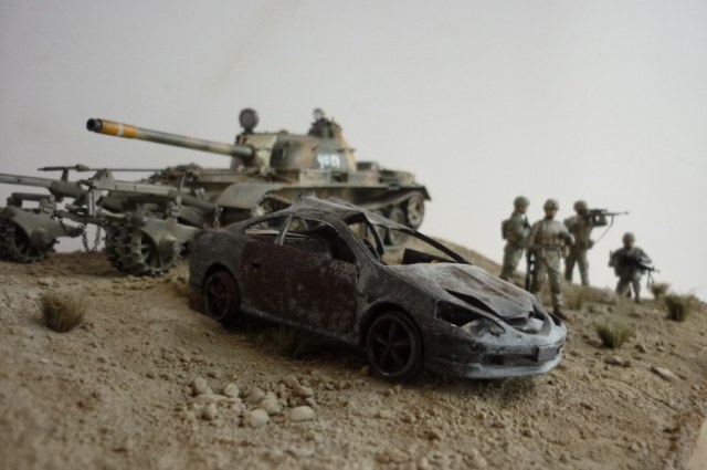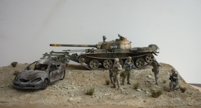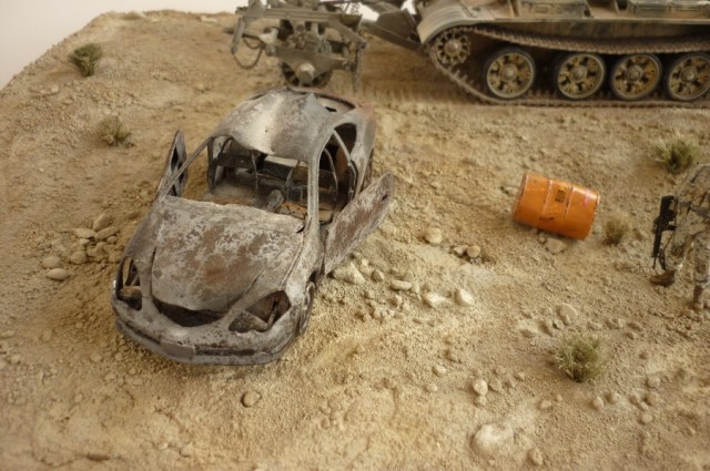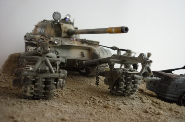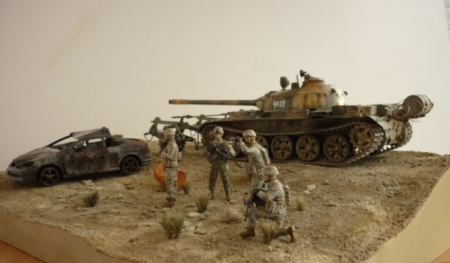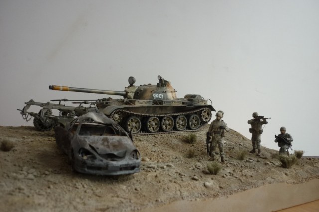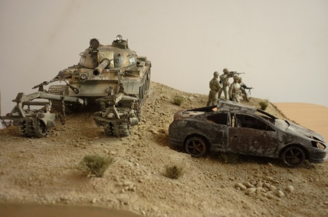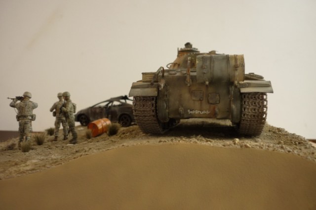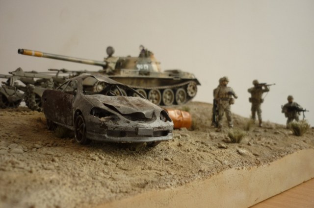 И предложение по изменению сюжета диорамы (но это совсем другая история) - танк сталкивает сгоревшую машину с дороги! Солдаты идут сзади (или их вообще убрать).
