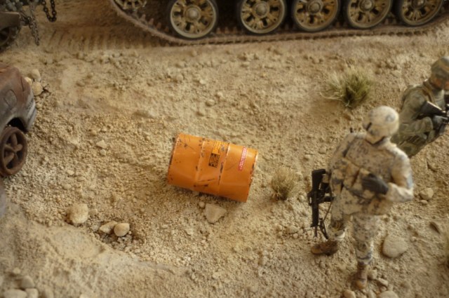 Ну предположим американская пехота обнаружила покинутый танк! авто когда то давно сгорело так как следов сажи на песке нет, ветерком унесло, ну и кто то бочку выкинул.