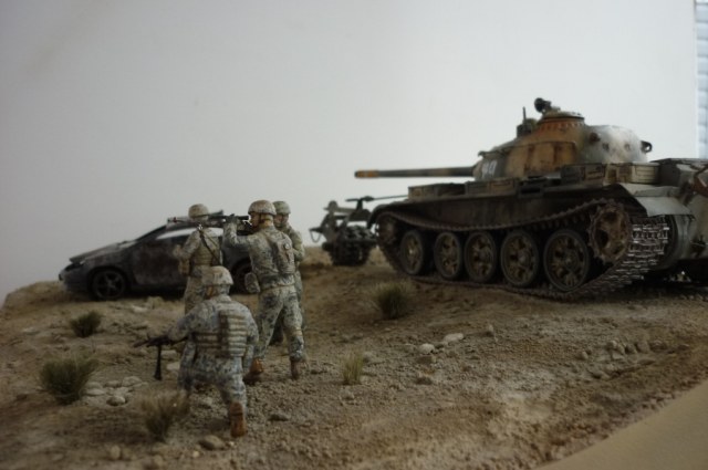 Исполнение моделей и солдатиков понравилось, а вот сюжета я к сожалению не увидел. Просто стоит танк, сгоревшая машина и отдельно чем то заняты солдаты.