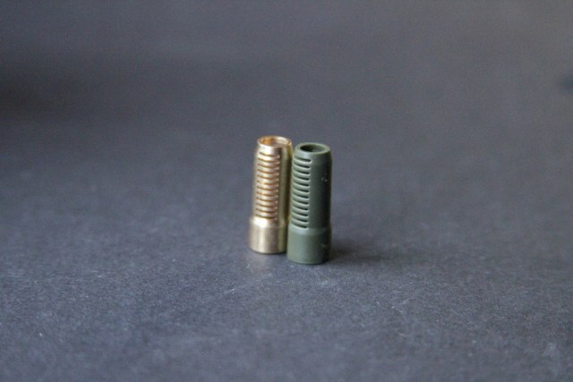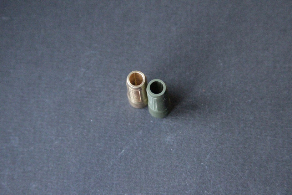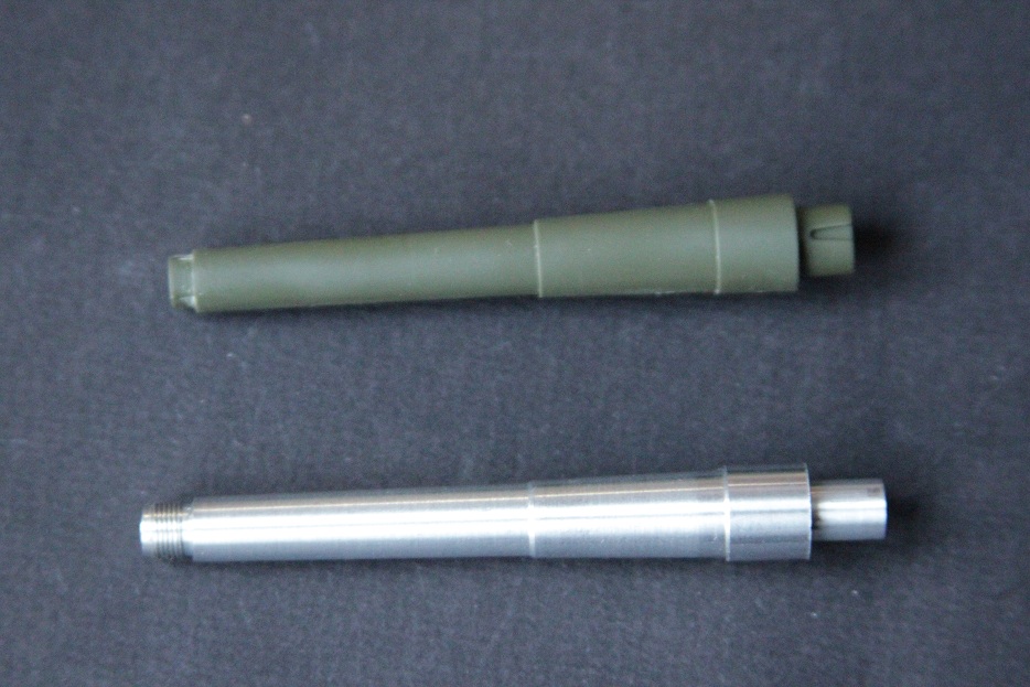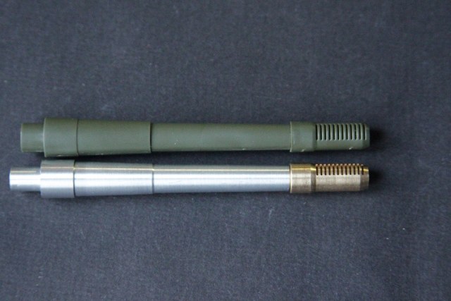 Ствол упакован как обычно в пакетик, состоит всего из двух частей сам ствол и дульник, ствол собирается очень просто всё на резьбе, ещё орудие имеет нарезку, чего конечно нет в пластике. Для сравнения привожу фото пластикового ствола, который собирается из двух половинок.