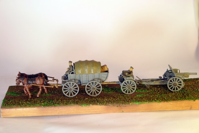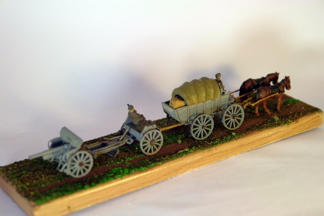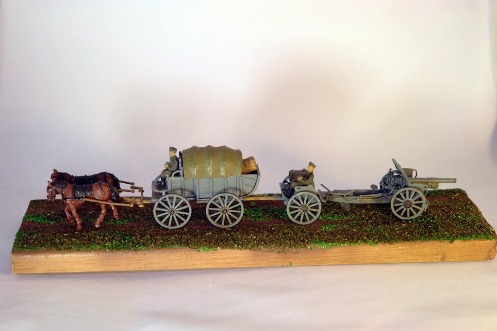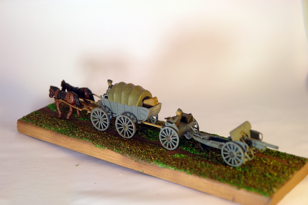 "Мы едем едем едем..." В честь 100 летнего юбилея Великой войны. Имеем немецкую гужевую повозку и пушку. Решил сделать на подставке. Не знаю, на сколько такое могло быть, но пусть будет. Добавил ящиков. Набор HAT очень легок в сборке, идет думаю для воргеймеров, Асе же наоборот чрезвычайно сложен. Подставка- наличник, окраска Тамия и всякая химия.