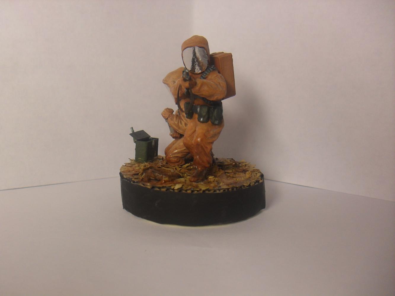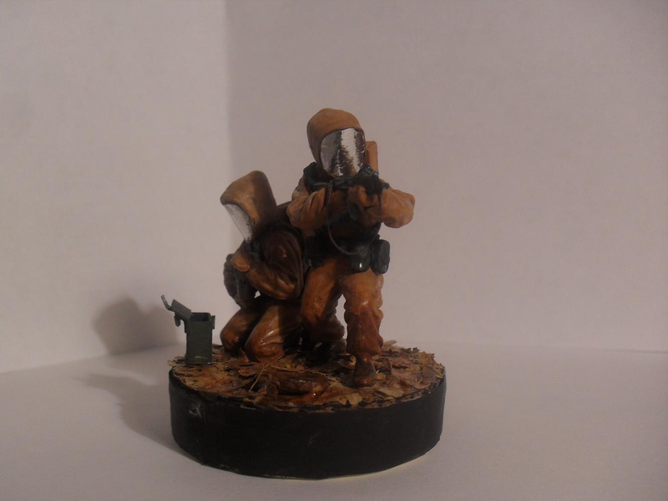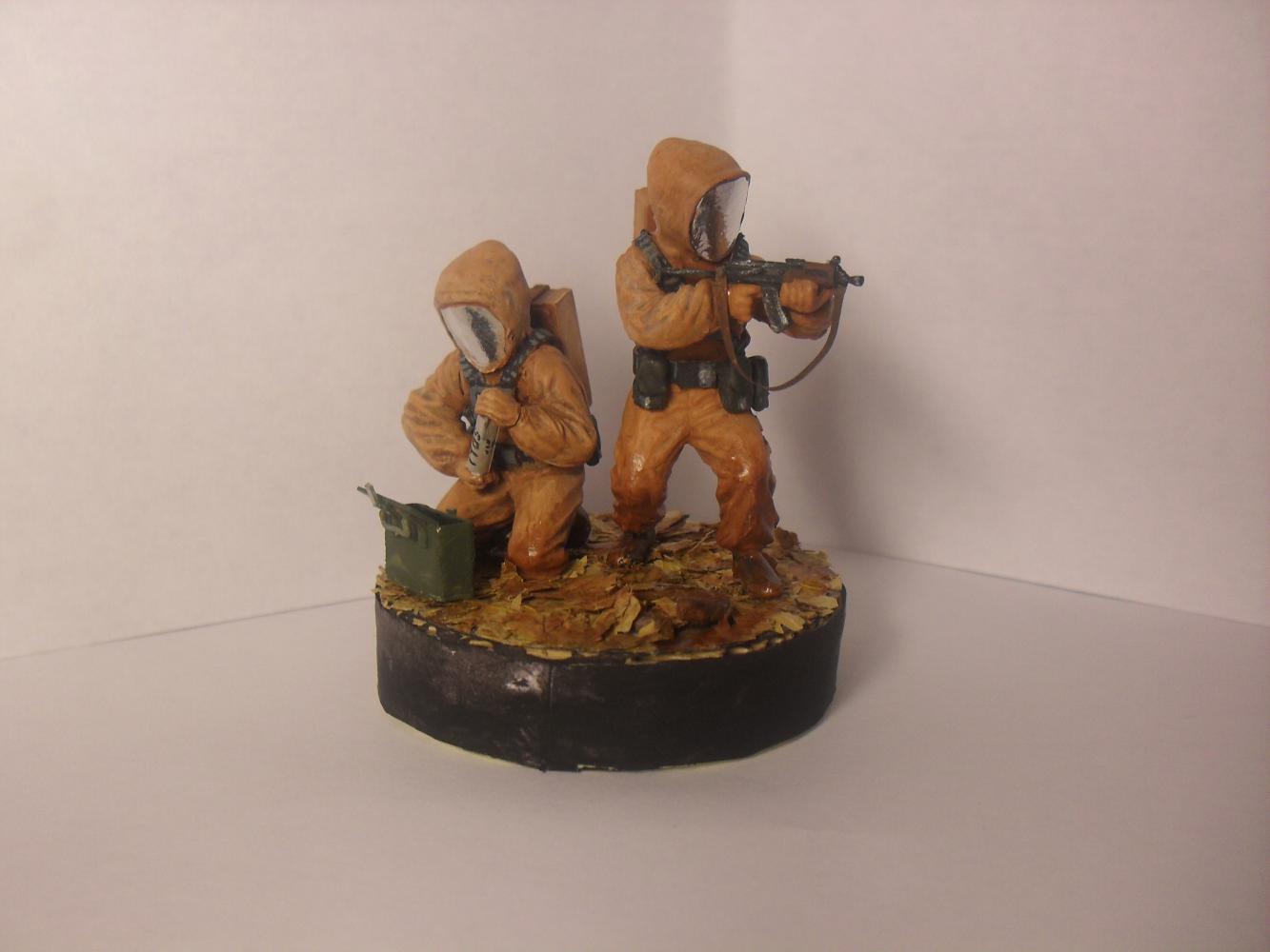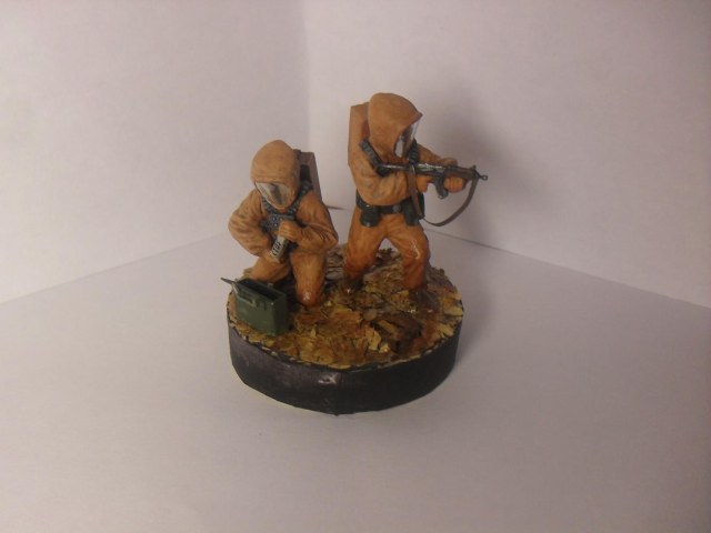 Модели взяты из набора Звезда (советская штурмовая группа). Шлема костюмов из бумаги + фольга. Кейс и картона. Листья натуральные, сушеные. Красил красками от звезды, кистью. Лак матовый (для слабого блеска) (имитация влажности)