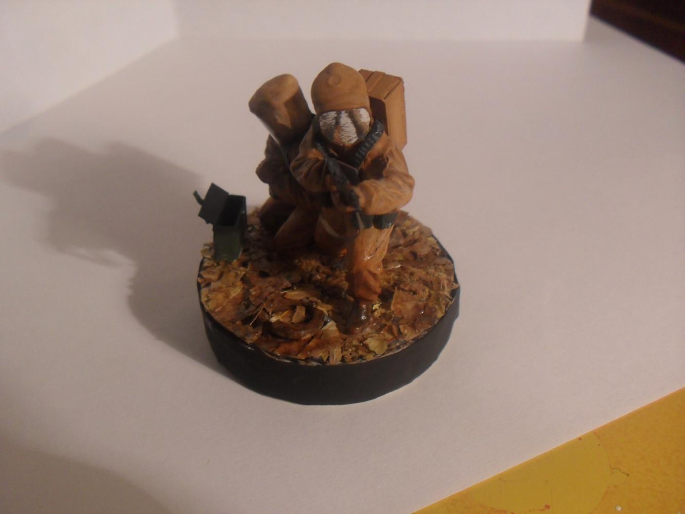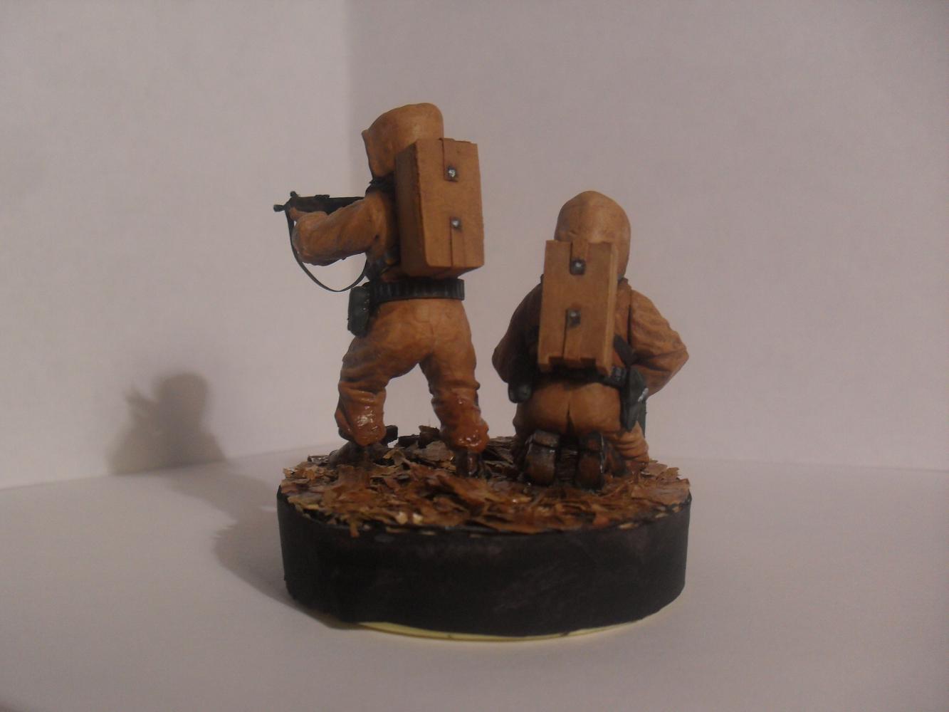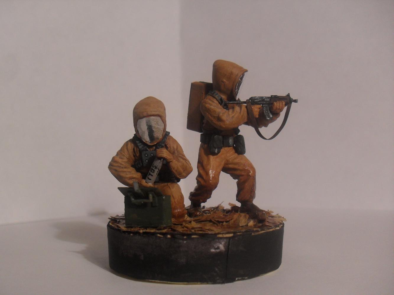 Модели взяты из набора Звезда (советская штурмовая группа). Шлема костюмов из бумаги + фольга. Кейс и картона. Листья натуральные, сушеные. Красил красками от звезды, кистью. Лак матовый (для слабого блеска) (имитация влажности)