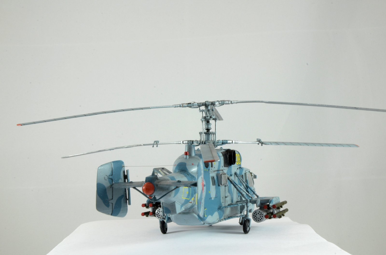 Из доработок: Встраивание кабины которая изначально идет к Ка-29 от Звезды, Открытие грузового отсека, Замена тяг автомата перекоса, укорачивание задних стоек (чтоб на зад чуть присел), рассверливание блоков НУРС, антенна из проволоки диам 0,01мм.