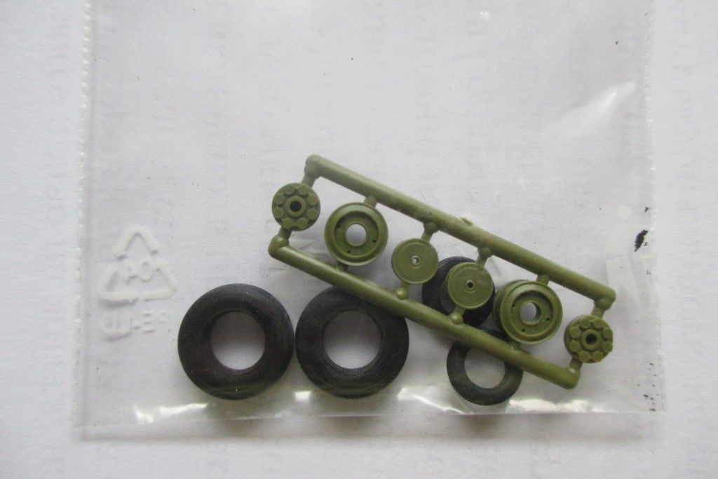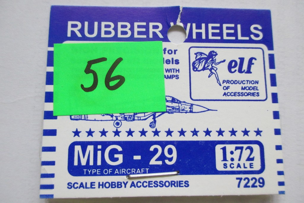 Всем привет. Представляю колеса для Миг-29 от Эльфа. В маленький пакетик вложен литник зеленого цвета на котором размещены детали для дисков колес. Диски переднего шасси состоят из одной детали, задние из двух. Шины сделаны из мягкой резины, четко виден продольный протектор. При более подробном рассмотрении видны даже надписи обозначающие размер шин. Как по мне детали сделаны очень даже хорошо. Хочется услышать мнение профи. Думаю обзор будет полезен всем моделистам.