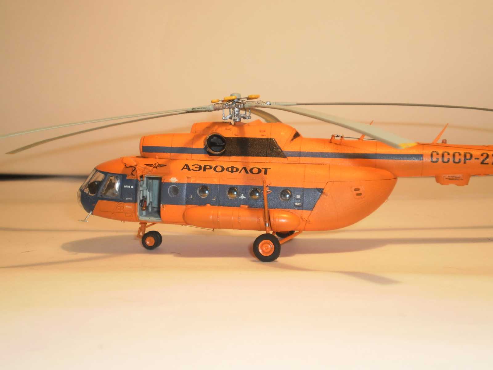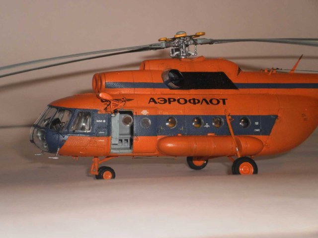 Ми-8т. Модель делал почти полтора года, с перерывами на работу, семью, гулянье с собакой, тренировки и модели на заказ. За время моей модельной карьеры восьмёрок в разных модификациях было сделано порядка десяти штук (в личной коллекции их только пять). По роду своей работы, я часто и много летаю на этом аппарате и поэтому хотелось собрать его максимально приближенным к оригиналу. Сначала, это была модель от Чехословатской фирмы КР модель хорошая для своего времени, но был косяк с фонарём, да и модель была честно говоря дубовая, но не боги горшки обжигают, многие моделисты собирали вполне приличные модели, но фонарь портил настроение. Потом появилась ваккумная модель ми-8, правда мне не довелось ее лицезреть. Но вот появилась Звезда и опять двадцать пять, фонарь не в какие ворота да и дубоватость осталась. В тему влилась фирма PROP@JETсо своим вакку фонарём (кто делал, тот меня поймёт) и PART с травлёнкой, туда же кокпит от HELIBORNE. И вот ваш покорный слуга опробывал все это на Звездовской модели (результаты видели все и критиковали кто как мог). Но тут появились китайцы и о чудо, фонарь вроде бы похож, но по модели есть косяки. И опять ваш покорный слуга попытался сделать, что-то похожее на оригинал с добавлением капотов двигателей от «Павла» и с некоторыми переделками модель была собрана на заказ (смотрели и критиковали). И вот, я подумал, а чего ждать, отпилил кабины у китайской и нашей модели, за основу взял фюзеляж от звезды и соединил с кабиной от хобби-босса, прилепил топливные баки, и все остальное китайское с некоторыми доработками. Добавил кокпит от HELIBORNE, травленку от Эдуарда и PATR, колёса от Экипажа, деки от Бегемота. Мужики говорят, что очень классно получилось и встали в очередь. А меня опять берут сомнения.