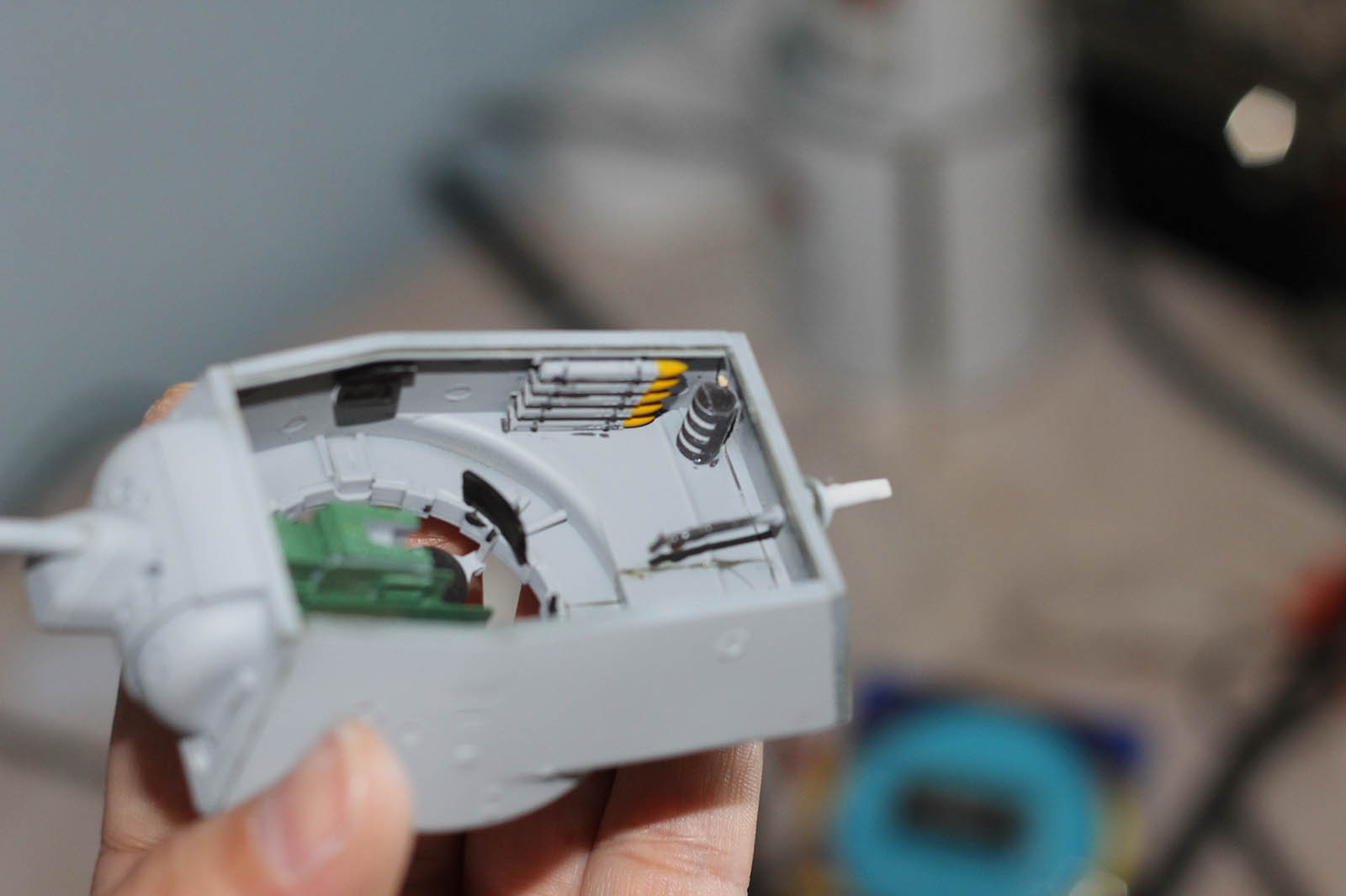 Окрашивалась в основном акрилом Mr.Hobby и местами Звездовской из подарочного набора. Тонирование маслом и уайт-спиритом из строймага. Грифель. Также использованы пастельные мелки, "пудреница" Tamiya. Грязь прикреплять не стал, потому что кто-то вылил ПВА в раковину. Да и надоело мне красить под конец танк, потому что немного разочаровался цветом после тонировки. При тонировке кистью повредил краску. Повторно попробовал тонировать аэрографом. Понравилось, ложится идеально ровным тонким слоем. Аэрографу масло тоже понравилось. В итоге, на мой взгляд, не попал в тот цвет, который хотел. Он получился излишне коричневатым. С траками тоже конфуз вышел, сделал четкие виниловые, а с них краска лезть начала. Пришлось делать заново из наборных. Под конец работа шла без настроения, лишь бы "добить".