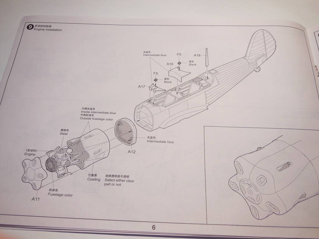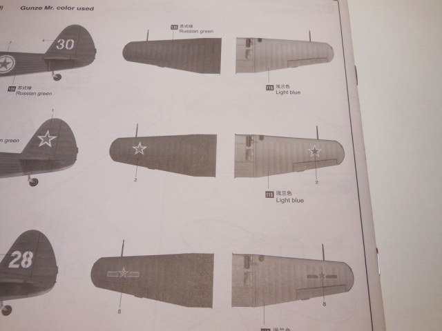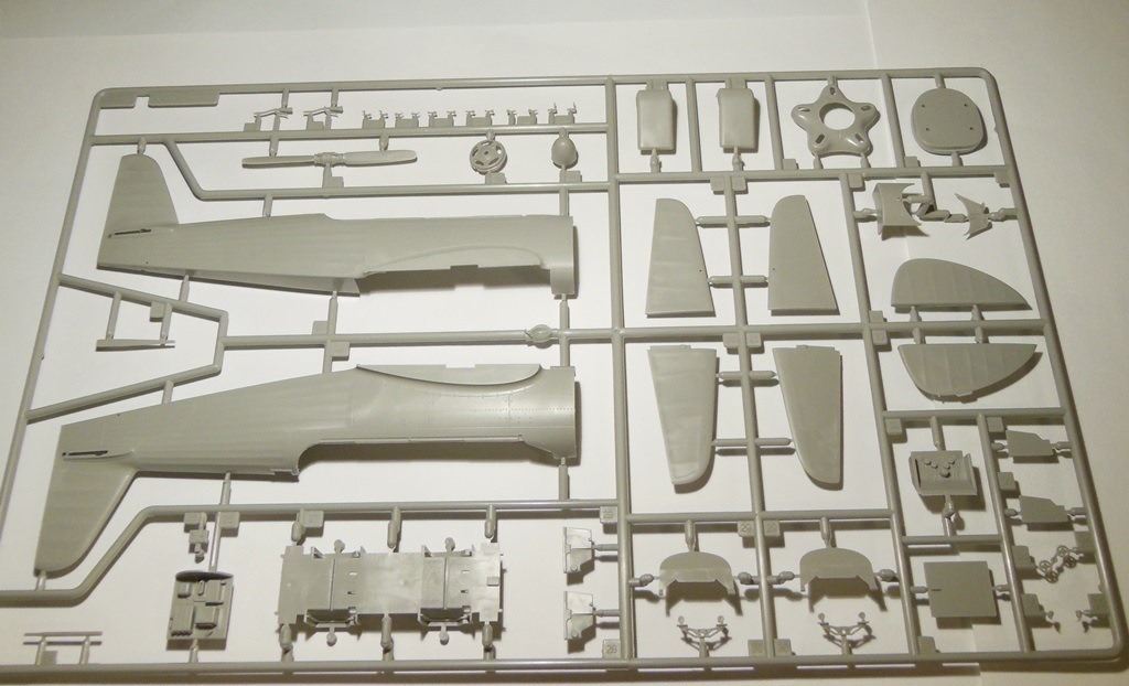 В коробке из плотного картона находятся четыре литника серого пластика, два прозрачных и один литник с резиновыми деталями, куда входят шины и тормозные шланги. Так же в наборе имеется афтермаркет, в частности слайдовая плёнка на приборную панель, небольшое количество фототравления, и металлические стержни, для подвижности элеронов. Инструкция сложена книжкой, весьма подробная и понятная. Декаль дана на три варианта окраски, включая советский, китайский и северокорейский борт.