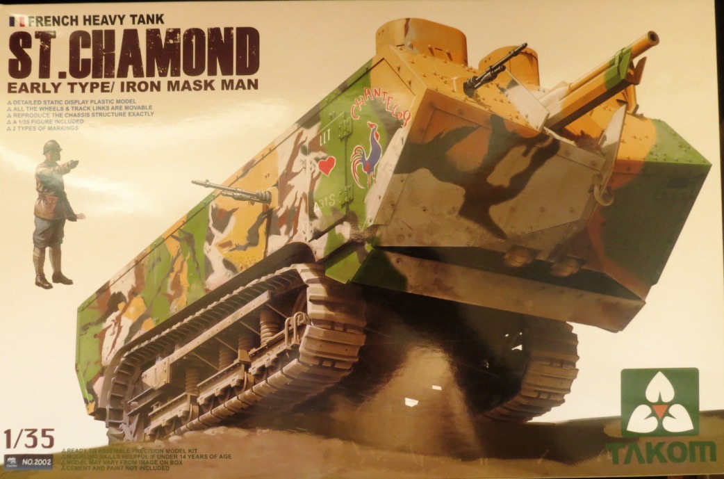 Всем привет.Французский тяжелый танк 1МВ.Создан на основе трактора Holt.С электрической трансмиссией .Прикупил данного монстра за 1600р.Размер в готовом виде 23см.Хорошее литье,гуси на защелках,два варианта окраски,допом только страшный человек в маске.В общем набор внушает доверия.