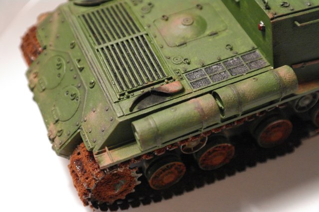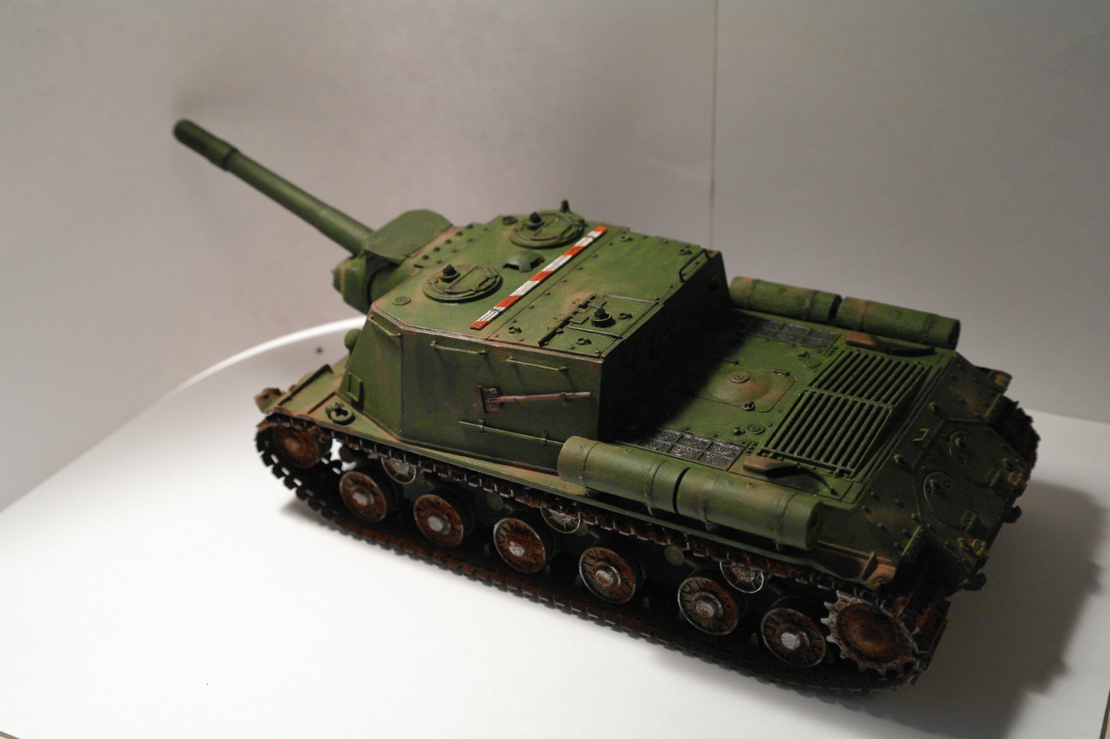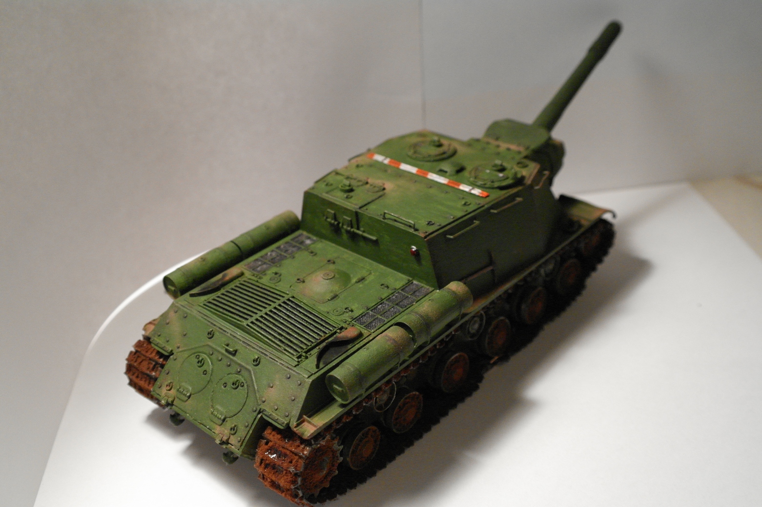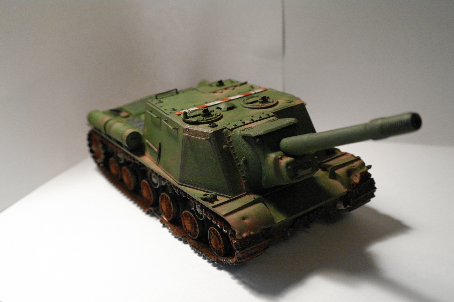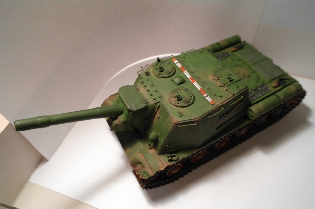Решил себя попробовать в моделизме и собрать свою первую модель. Купил модель ИСУ-152, фирма "Звезда", качество понравилось. Виниловые траки ужас. Смывку делал сам, смешивая масляную краску и уайтспирит. Пыль делал пастелью, перед покраской модель грунтовал, потом красил кисточкой, акриловой краской "звезда".