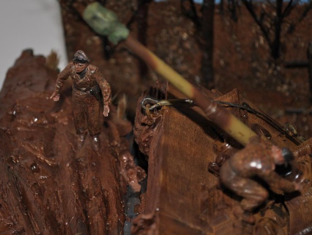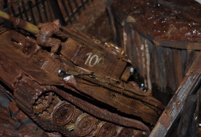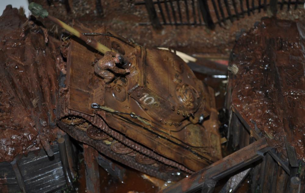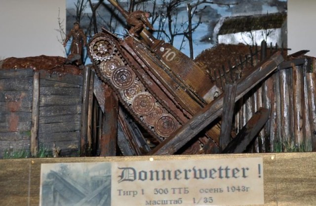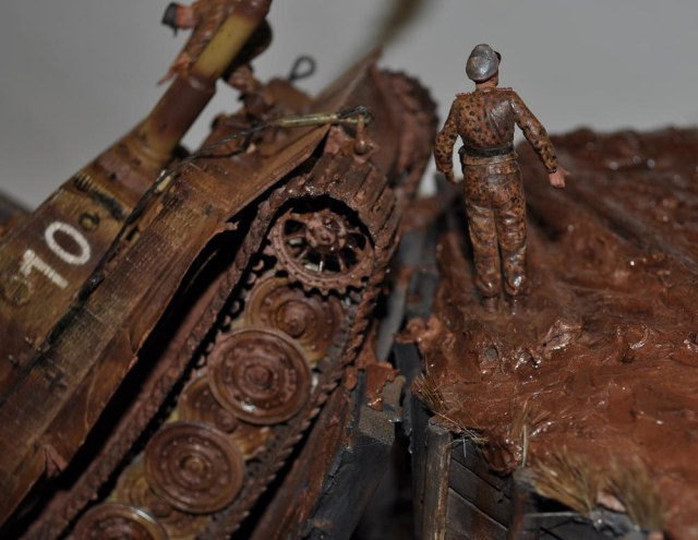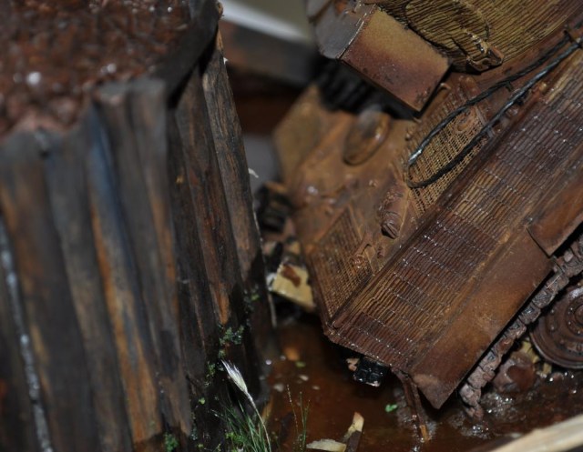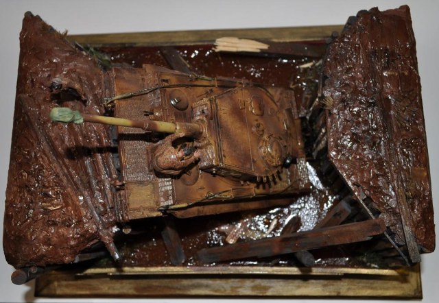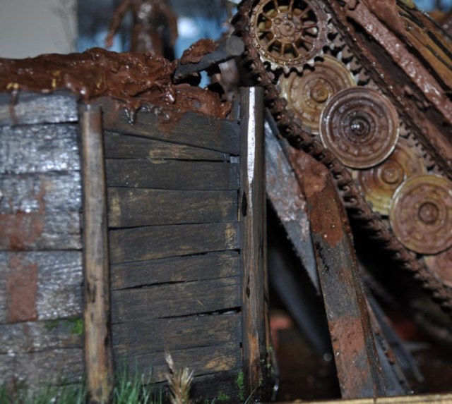 Причем здесь бои? Танк при просто своей массой сломал мост, вот и все. По поводу "соуса" глина после дождя вот от сюда и такой цвет, судя по оригинала на улице идет дождь или стоит туман. Вот в связи с этим блеск от лака для имитации сырости. Речка замутнела и окрасилась после падения моста. Попробую переснять при дневном свете.