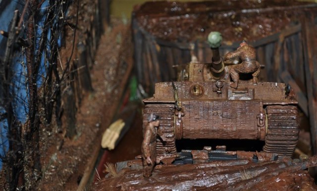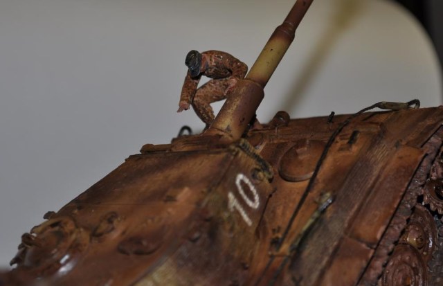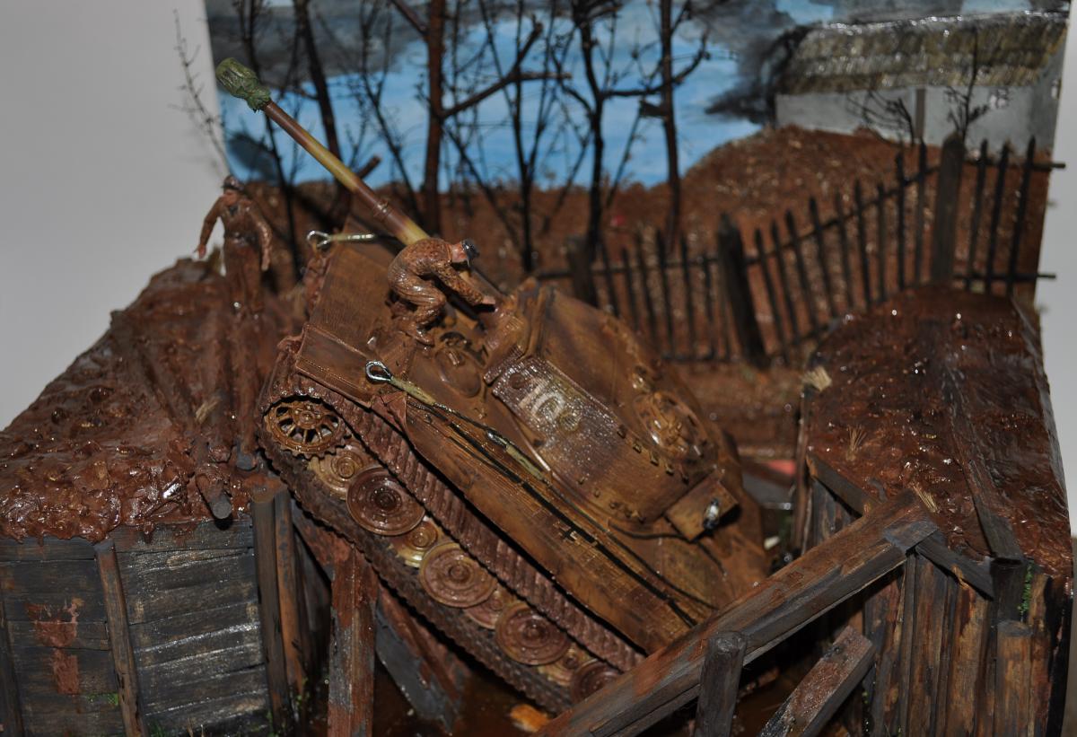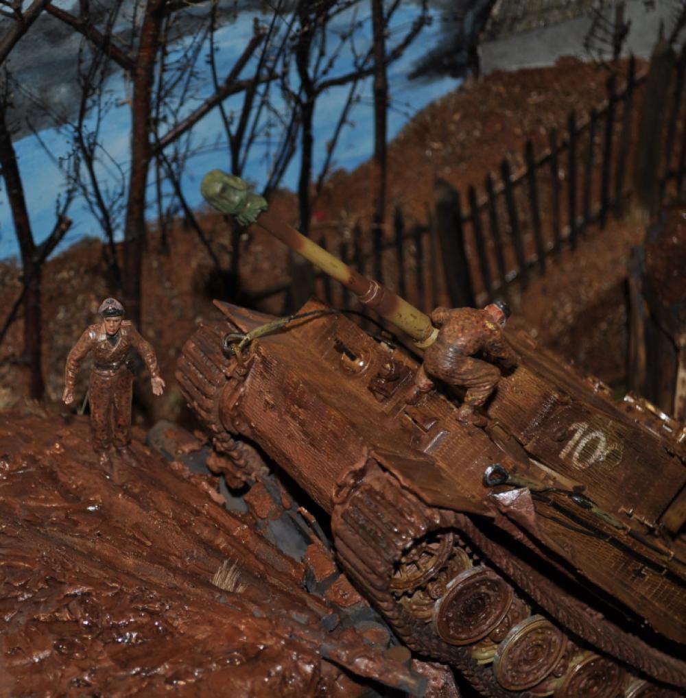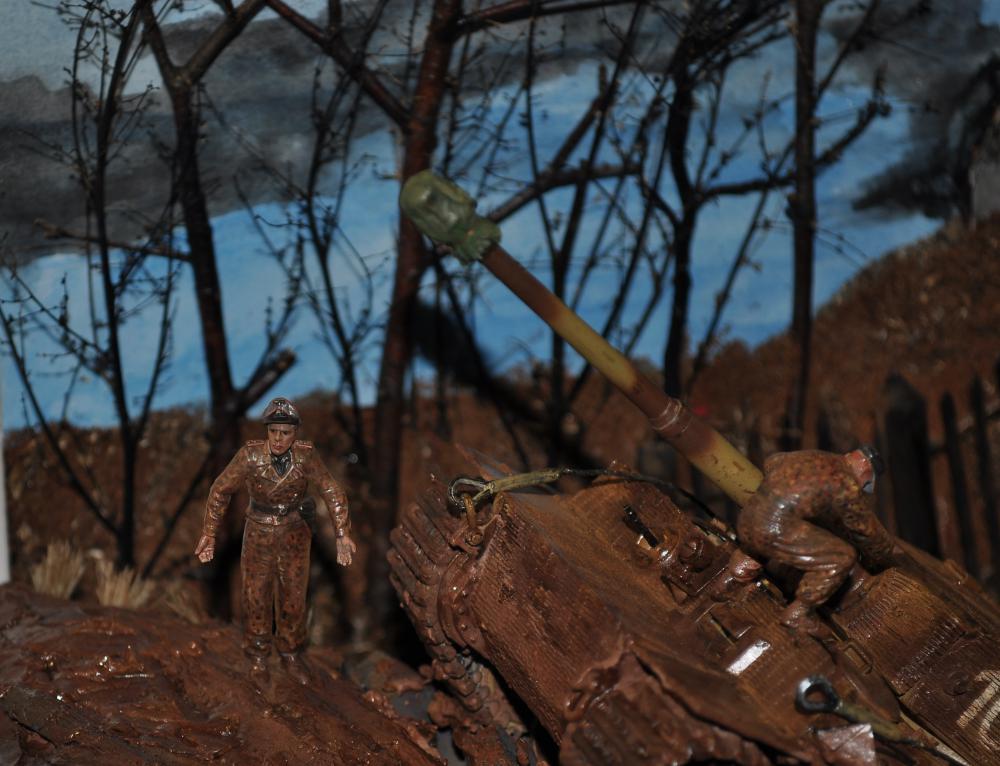...Не взыщите,но подробная информация не заменит добротно выполненной работы.Посудите сами:разве может быть ВСЁ коричневого цвета,как будто окунули в шоколад или грязь? Танк должен "нести"если не камуфляж,то его остатки и немцы возле танка тоже.