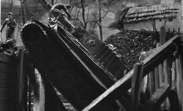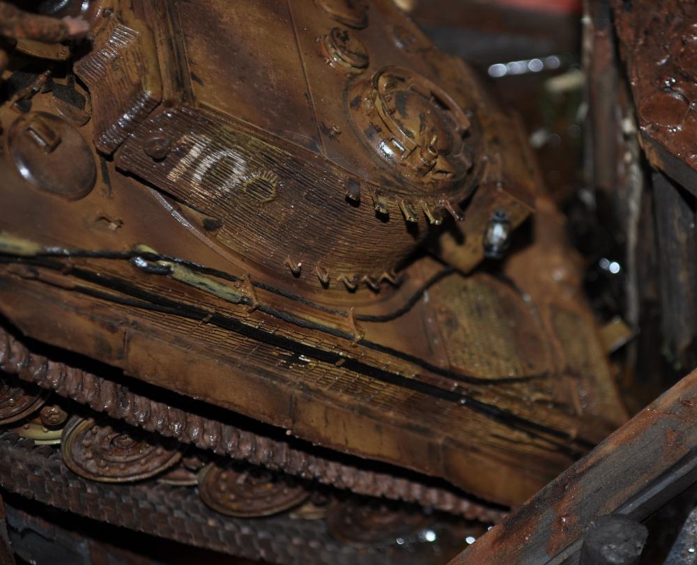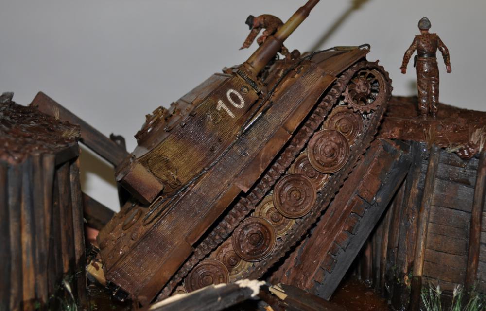 ...Танк сломал мост под собой и со всем весом упал в реку(?),ручей(?),сломав настил,сваи и т.д. Мне интересно,Вы представили,КУДА полетели грязные брызги и почему сломы деревянных частей такие свежие,если мост старый? И т.д.
